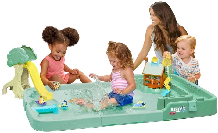 Discover splashy fun with the BLUEY Bushland Adventures kids’ set from Little Tikes. The spacious water play table features a slide, a hut with a water wheel, and channels for water flow. It includes 4 floating Bluey figures and smart accessories for pouring and damming. A durable plastic build, easy cleaning, and quick fold-up for transport ensure convenient use at home or in the garden.