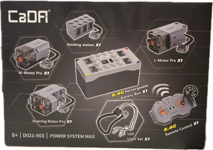 Expand your CADA builds with realistic power and lighting thanks to the Power System Max set. You get precise 2.4 GHz interference-free control, long battery life, and compatibility with many standard-size models. The package includes three high-performance motors, LED lighting, a remote controller, and a USB charging cable – everything you need to take the fun to the next level.