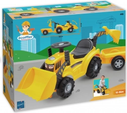 Children’s tractor by ECOIFFIER with a yellow trailer and an interchangeable bucket (bulldozer/excavator) is a great ride-on for the little ones. It offers a seat with storage, steerable wheels, and easy bucket control using grips by the steering wheel. Ideal for children from 12 to 36 months and a great companion for play at home and in the garden.