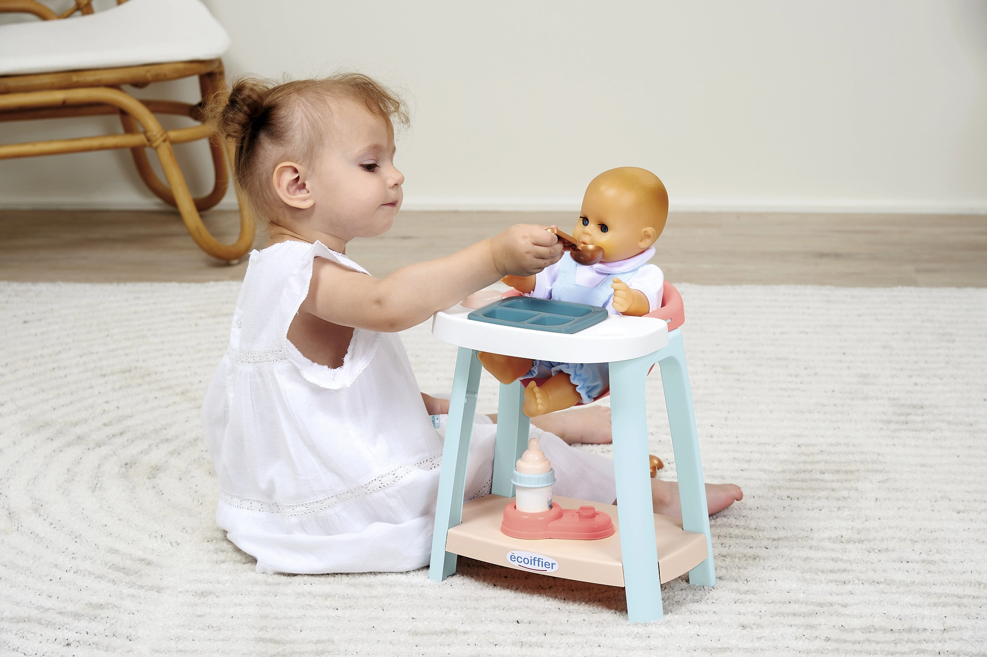 A stable high chair with a divided plate, cup, and cutlery lets children realistically “feed” the doll. Rounded edges and a sturdy construction support safe play.