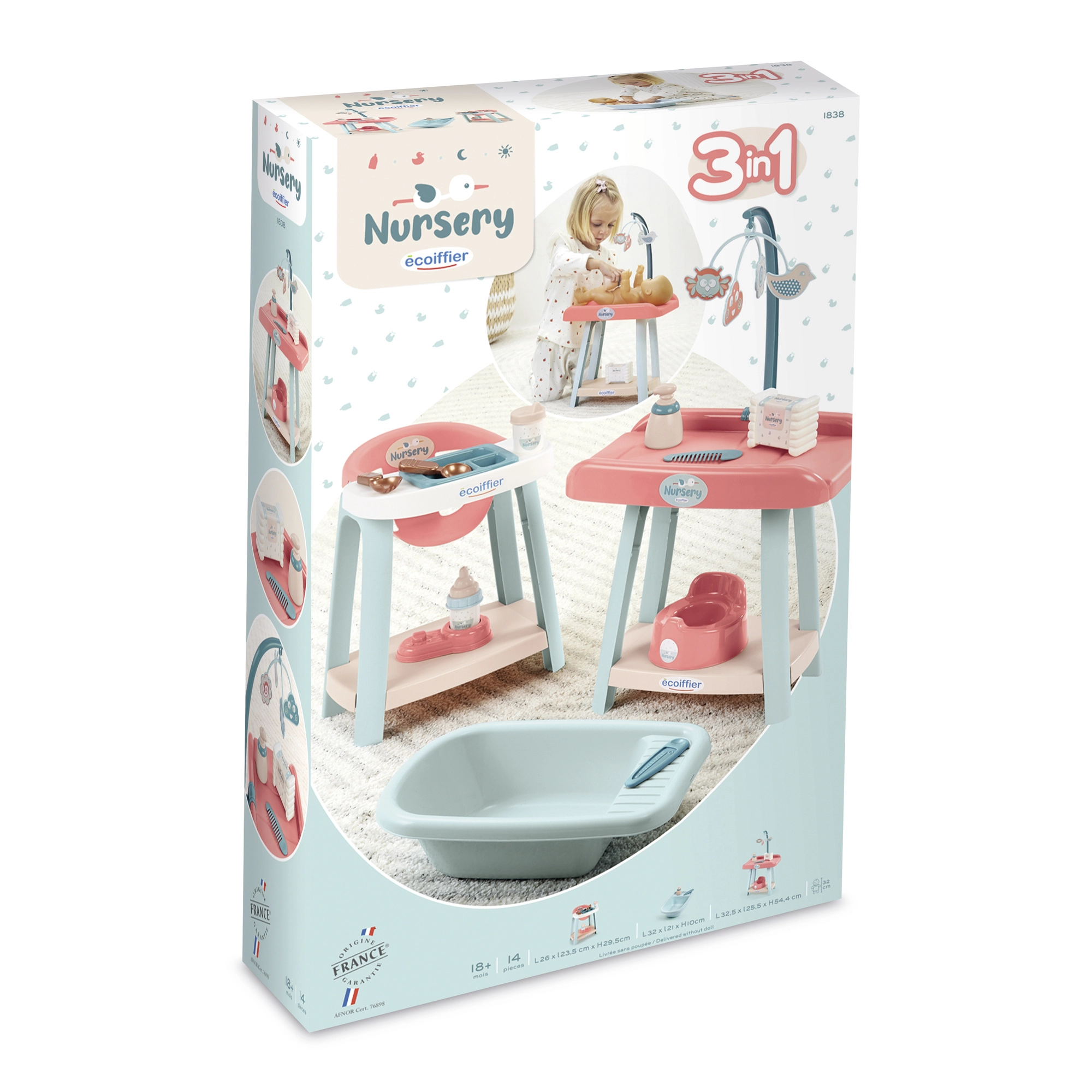 Ecoiffier Nursery 3-in-1 is a versatile doll-care set that offers everything from feeding and changing to bathing. Thanks to three play zones and rich accessories, children can imitate everyday baby care and create their own stories. Pastel colors and rounded shapes ensure a pleasant look and safe use.