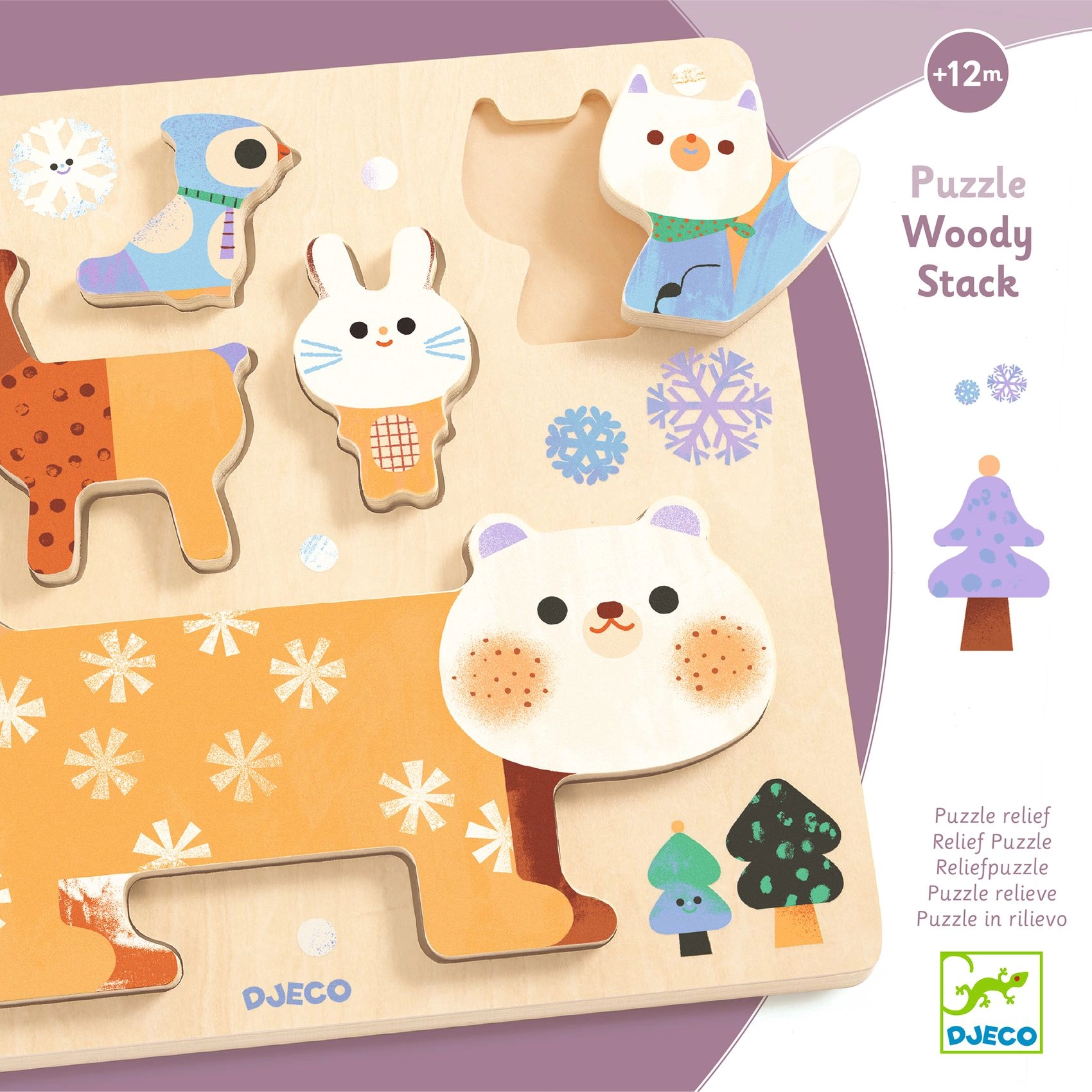 This set combines classic insert wooden puzzles with a balancing tower. The playful animals—bear, rabbit, bird, fawn, and owl—can be inserted into the board by shape or stacked into a tower to test balance. The game helps children develop patience and spatial awareness.