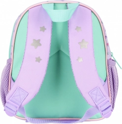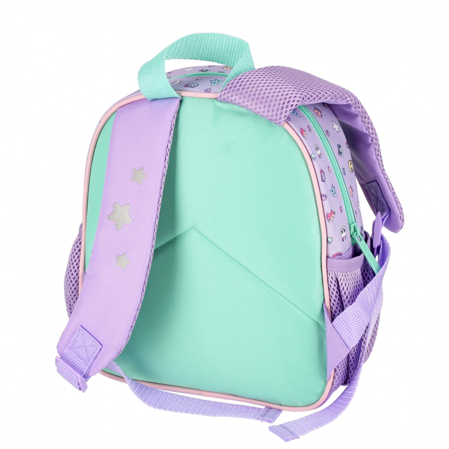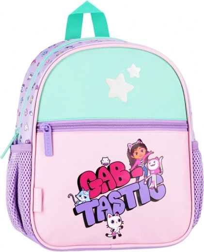 A cute children's backpack with a Gabby's Dollhouse theme in pastel colors, ideal for preschool, trips, and free time. It offers a main zip compartment, a front zip pocket, and side mesh pockets for a bottle. Thanks to the padded and adjustable straps, it’s comfortable even for smaller children. Suitable for kids ages 3+.