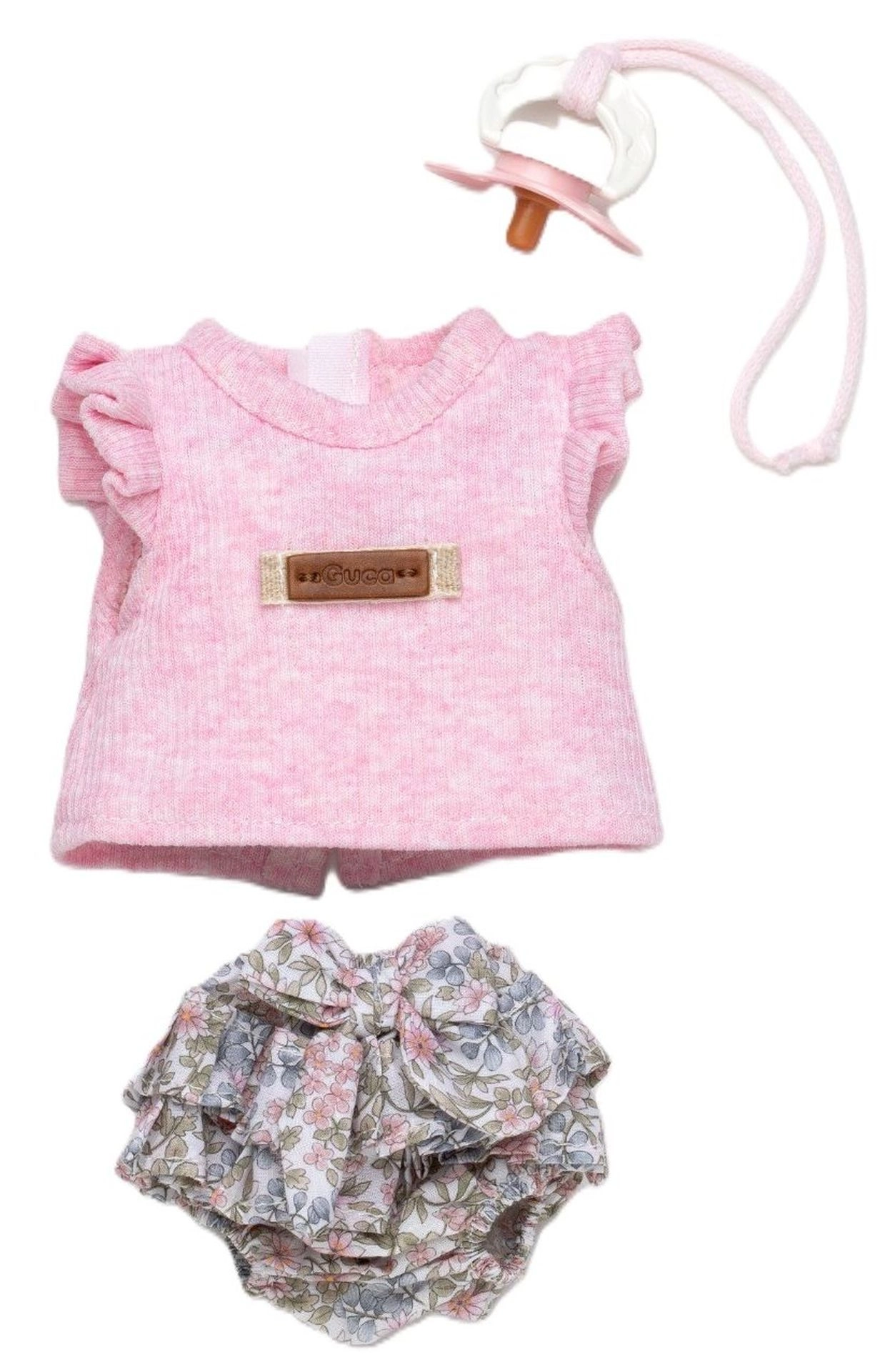 The pink ruffled top, floral bloomers, and pacifier create a perfectly matching set for everyday play and dress-up.