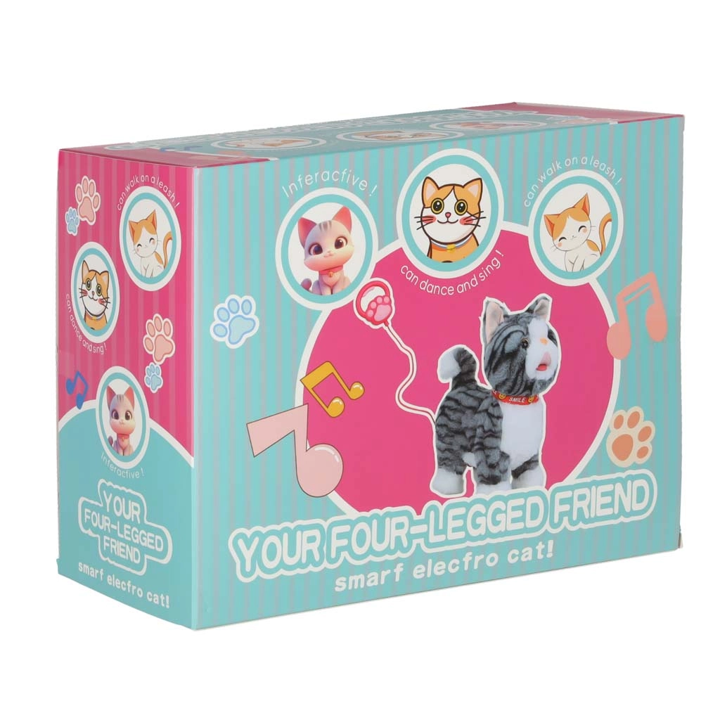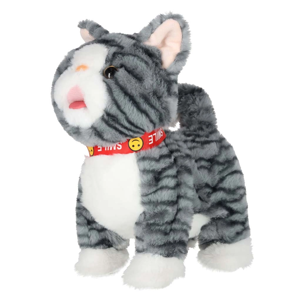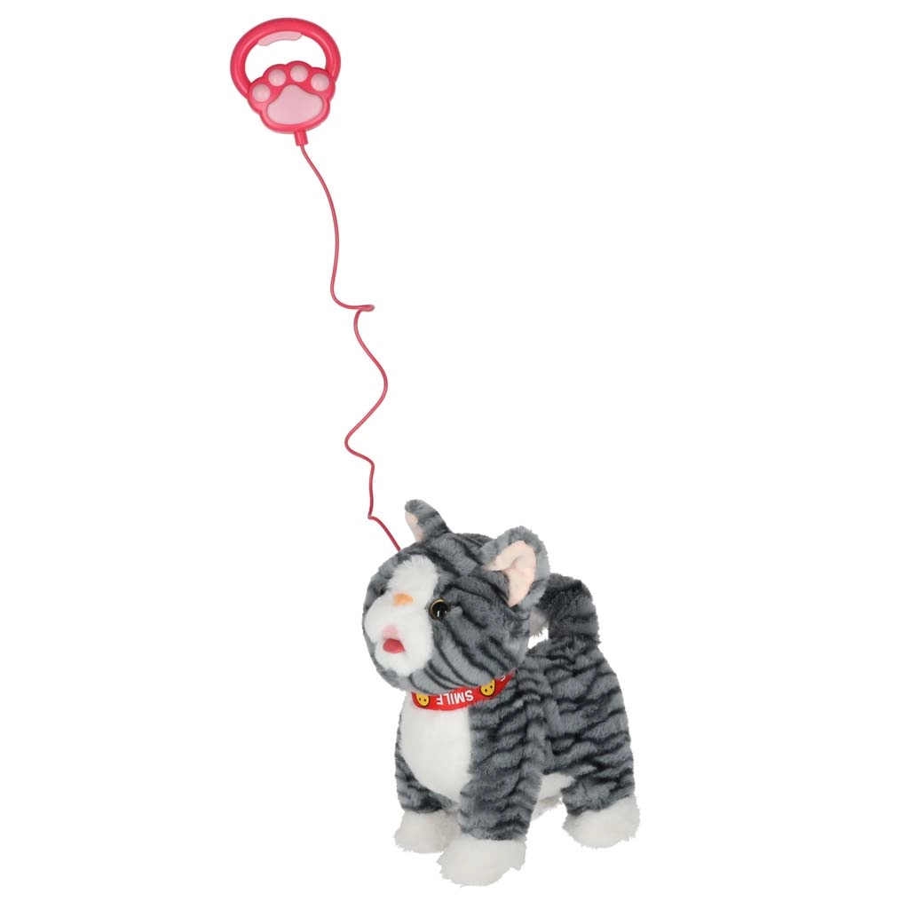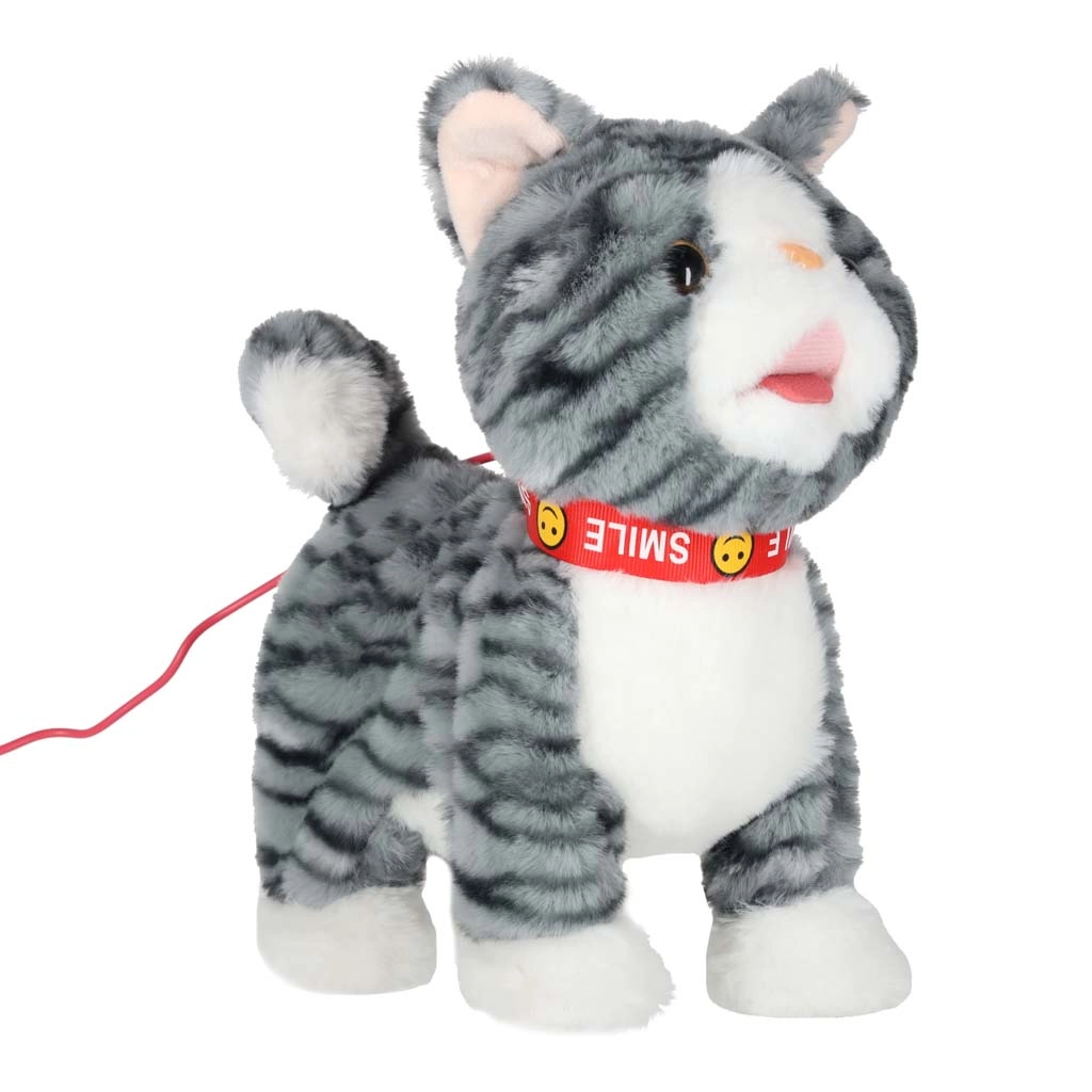 A cute interactive plush cat on a leash brings kids hours of fun. With the press of a button it walks forward, meows, wags its tail, and moves its tongue. The soft grey striped fur invites cuddles, while play also teaches pet care. An ideal gift for children aged 3 and up.
