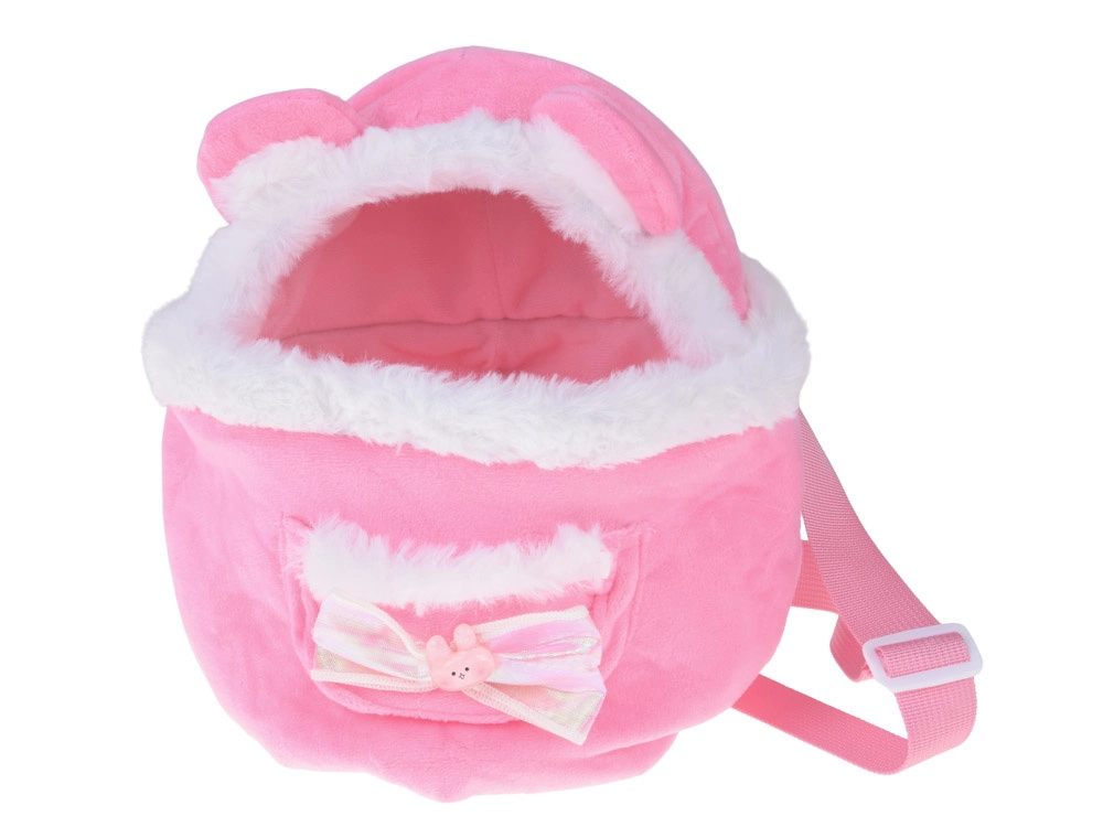 A cute backpack with ears, a soft trim, and a little pocket. Adjustable straps ensure comfortable wearing and space for the bottle and accessories.