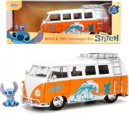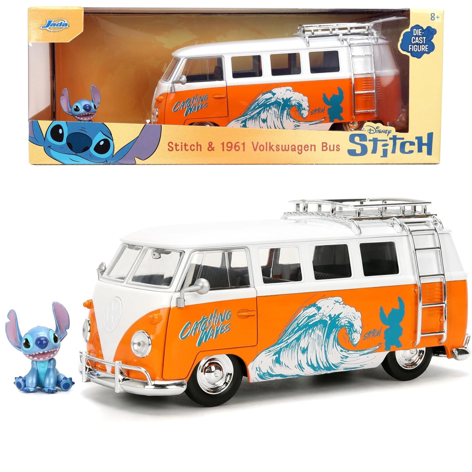 Collector set for DISNEY fans: a detailed metal Volkswagen T1 1:24 scale model and a 4 cm STITCH figure. The die-cast model features opening doors, realistic details, and smoothly rolling wheels. Ideal for display and play, a great gift for kids ages 8+ and retro car collectors.