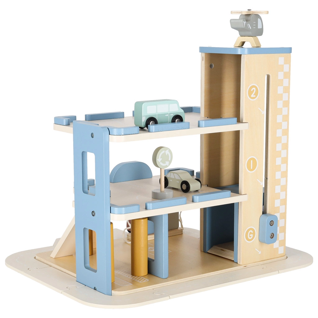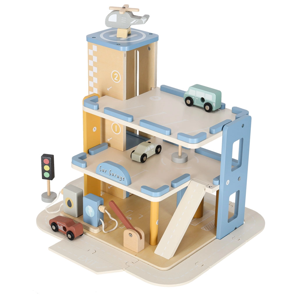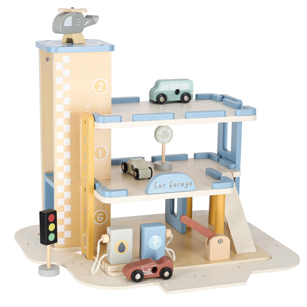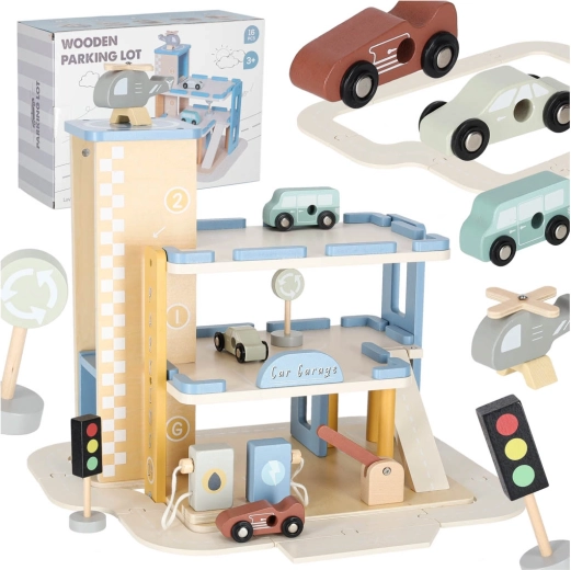 Discover quality wooden garages with an elevator and an integrated gas station for little car lovers. The set made of natural materials supports creative play, motor skill development, and learning traffic rules. A robust build, three-story design, functional elevator, pump, and rich accessories ensure hours of fun.