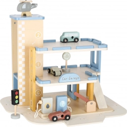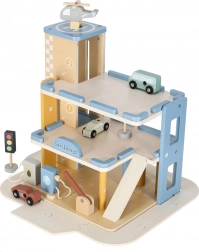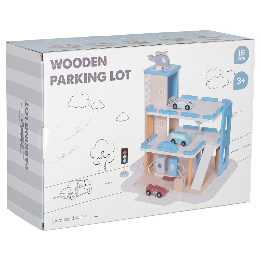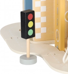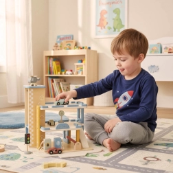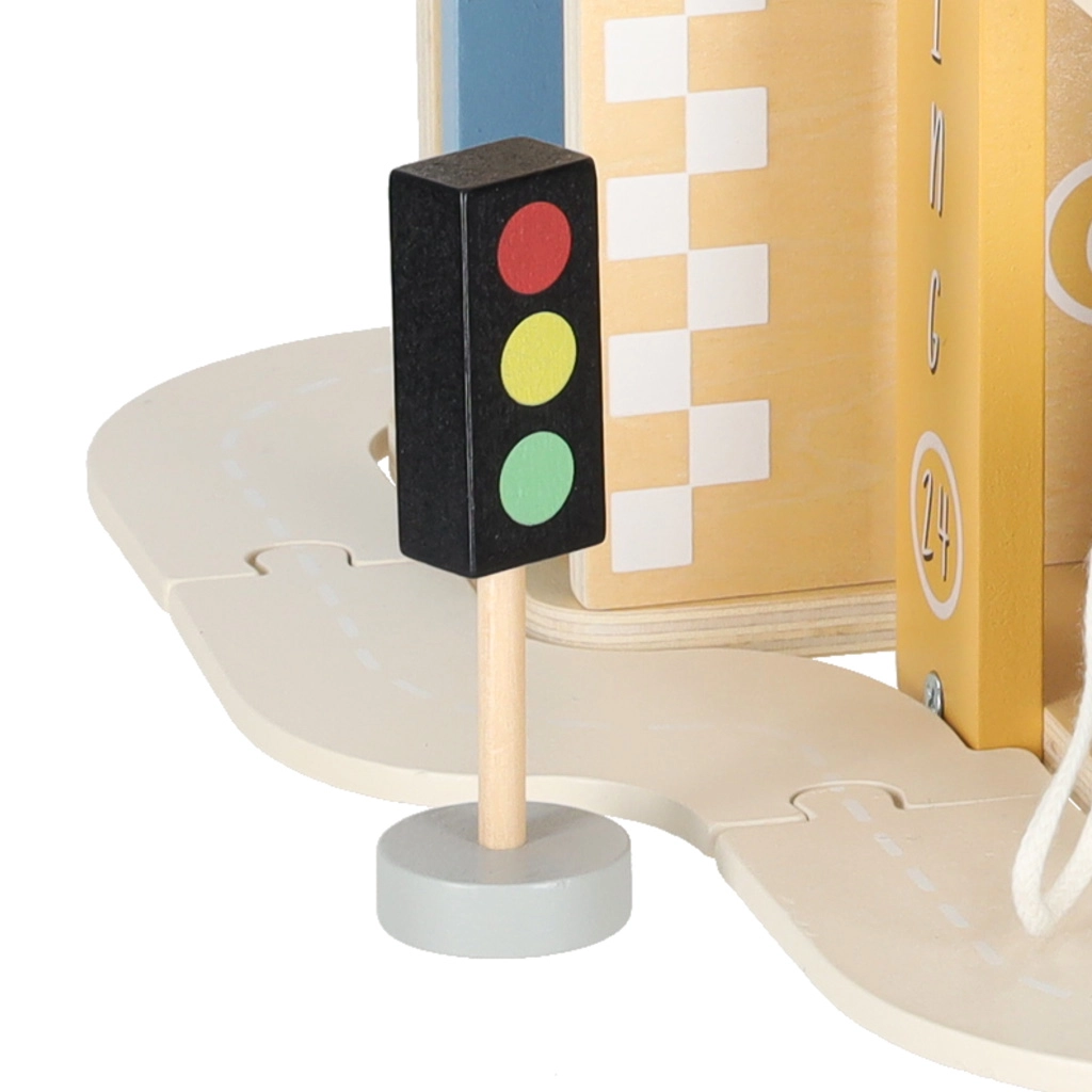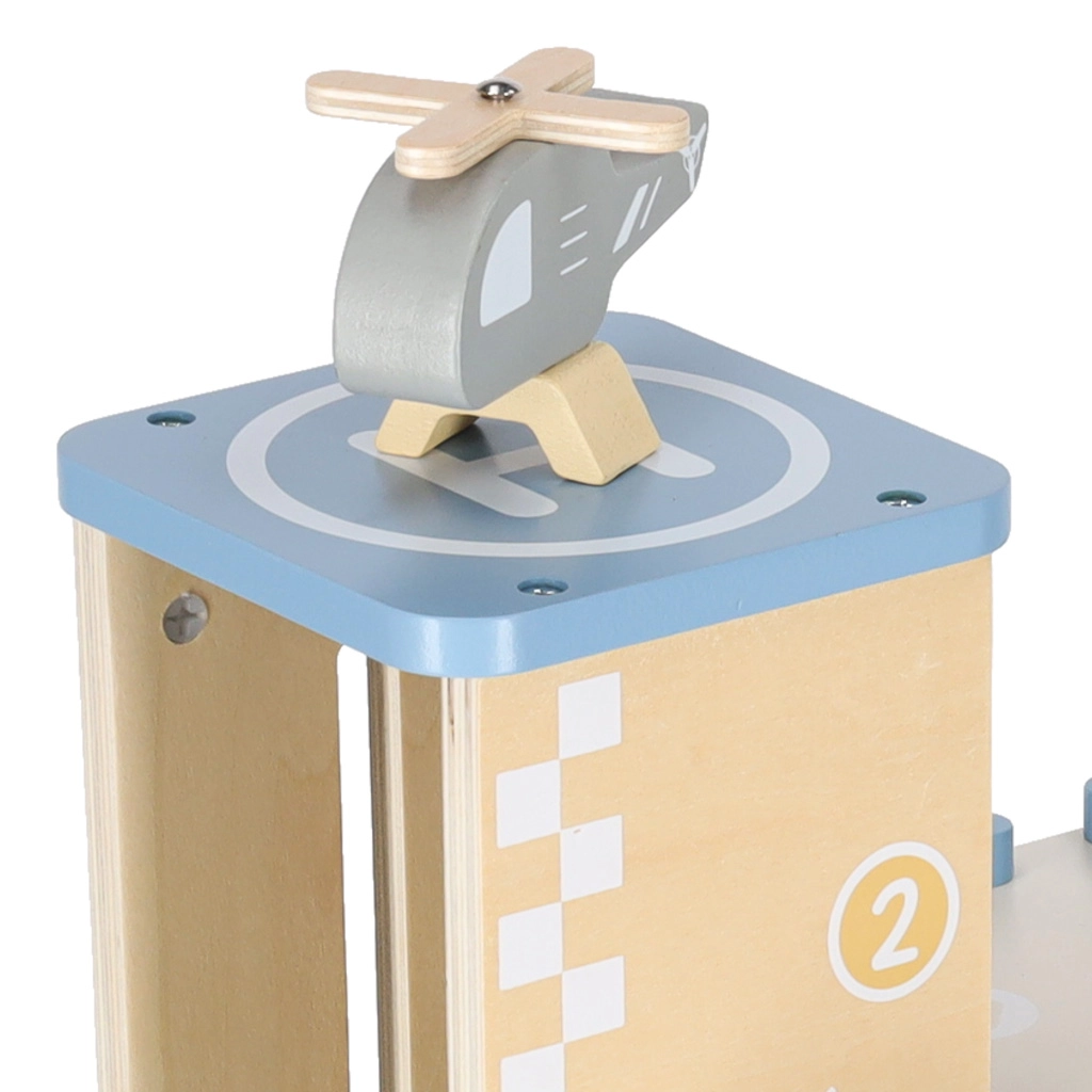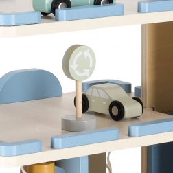 Discover quality wooden garages with an elevator and an integrated gas station for little car lovers. The set made of natural materials supports creative play, motor skill development, and learning traffic rules. A robust build, three-story design, functional elevator, pump, and rich accessories ensure hours of fun.