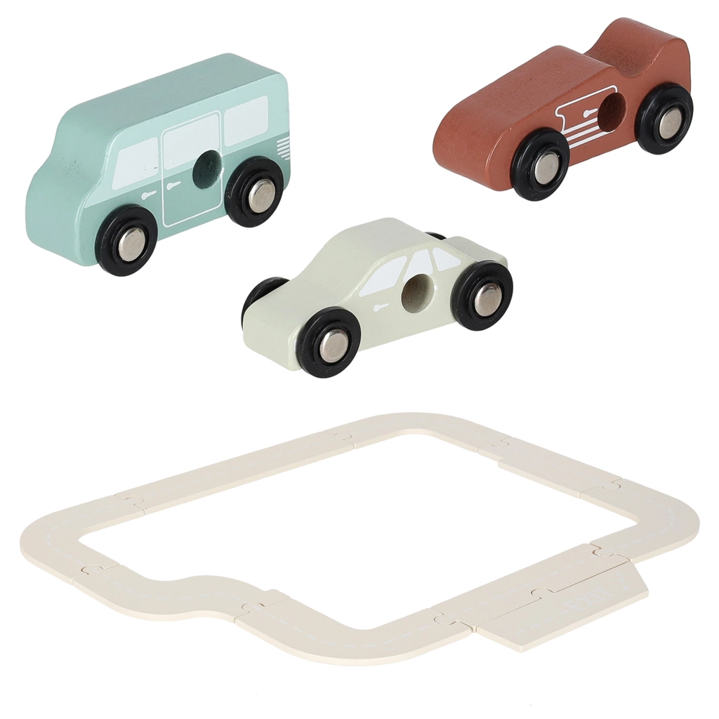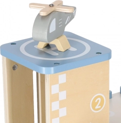 The box includes 3 wooden cars and a helicopter, so rescue missions, races, and peaceful parking can all take place.