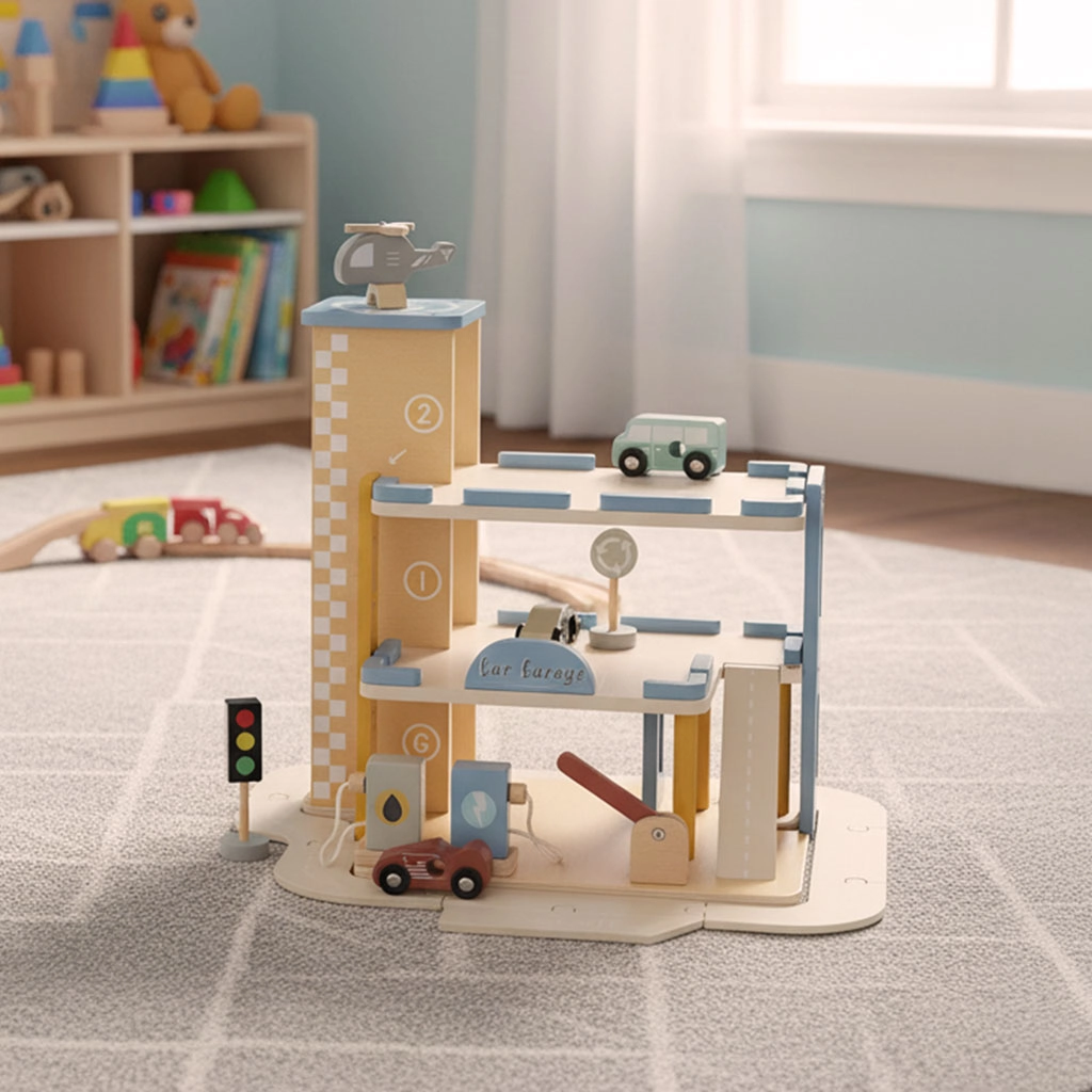 This multi-level wooden parking garage combines garages, service, and a gas station in one. Kids can lift cars with a moving elevator, drive up ramps, park on different floors, and top up “fuel.” Soft pastel colors and smooth wooden finishes feel pleasant to the touch and look great in any kids’ room.