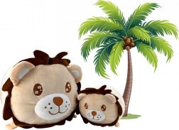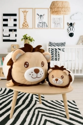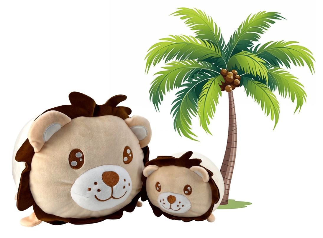 Compact 20 cm lion for the smallest kids and a larger 40 cm version as a comfy travel pillow at home or on the go.