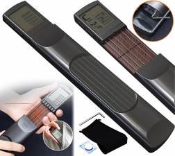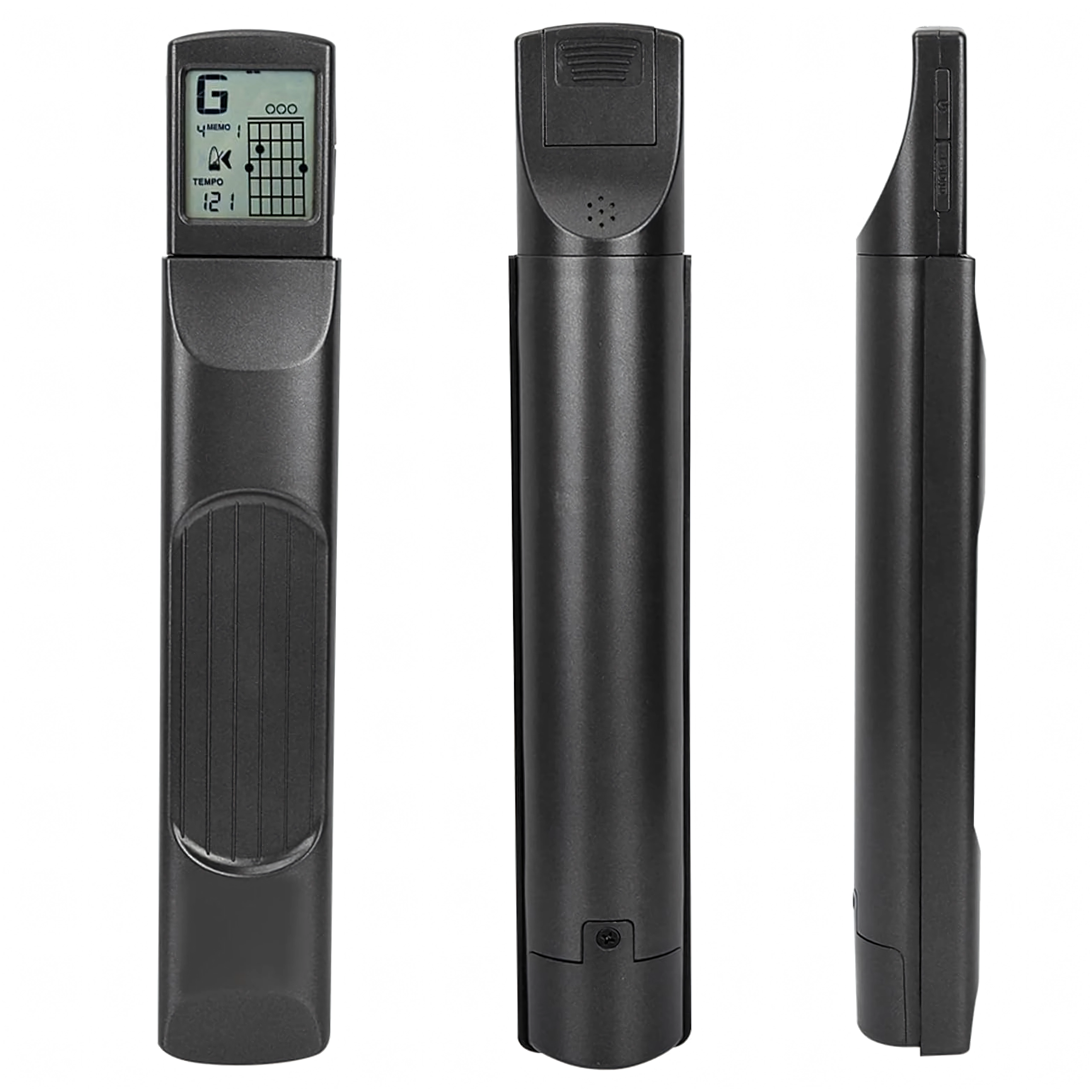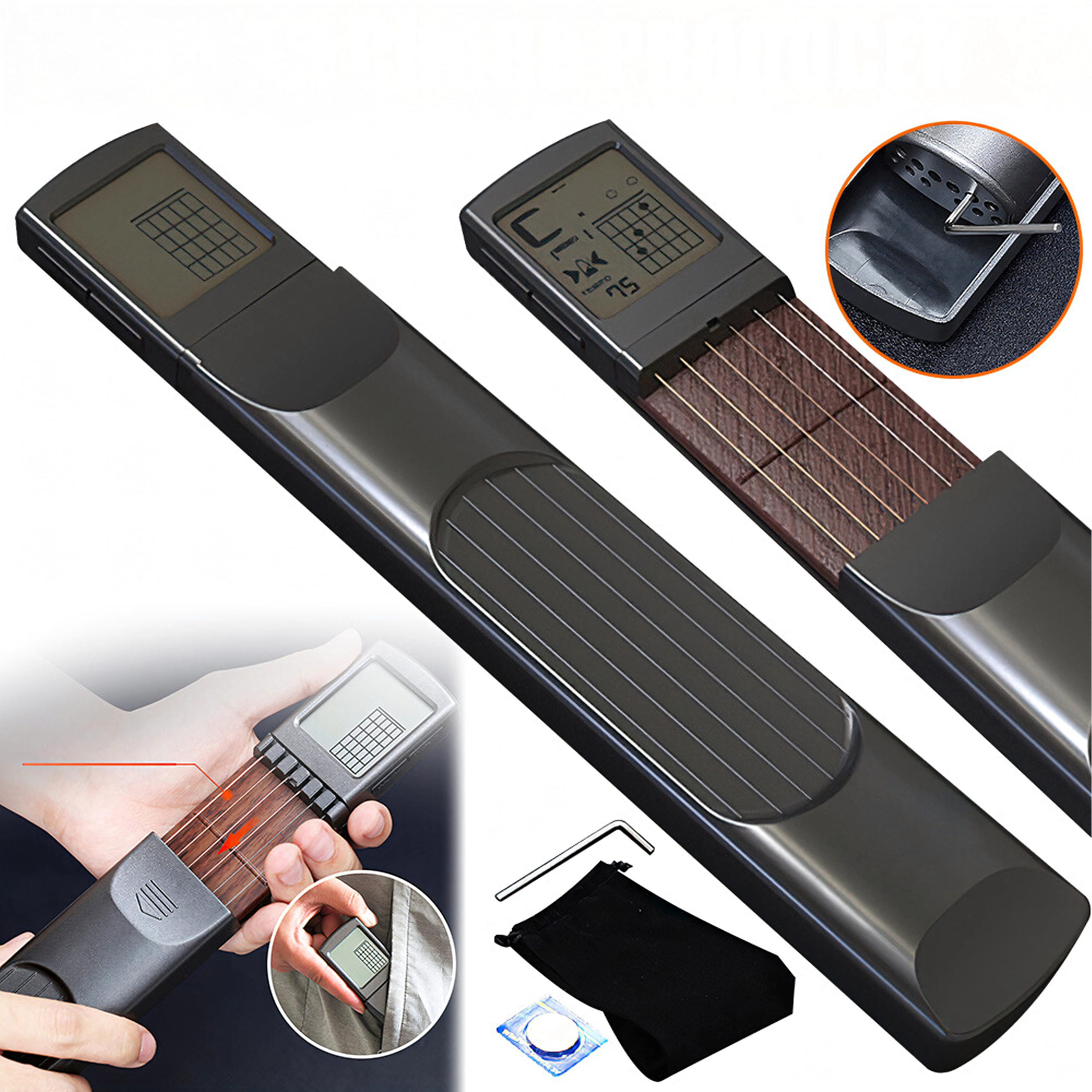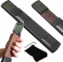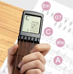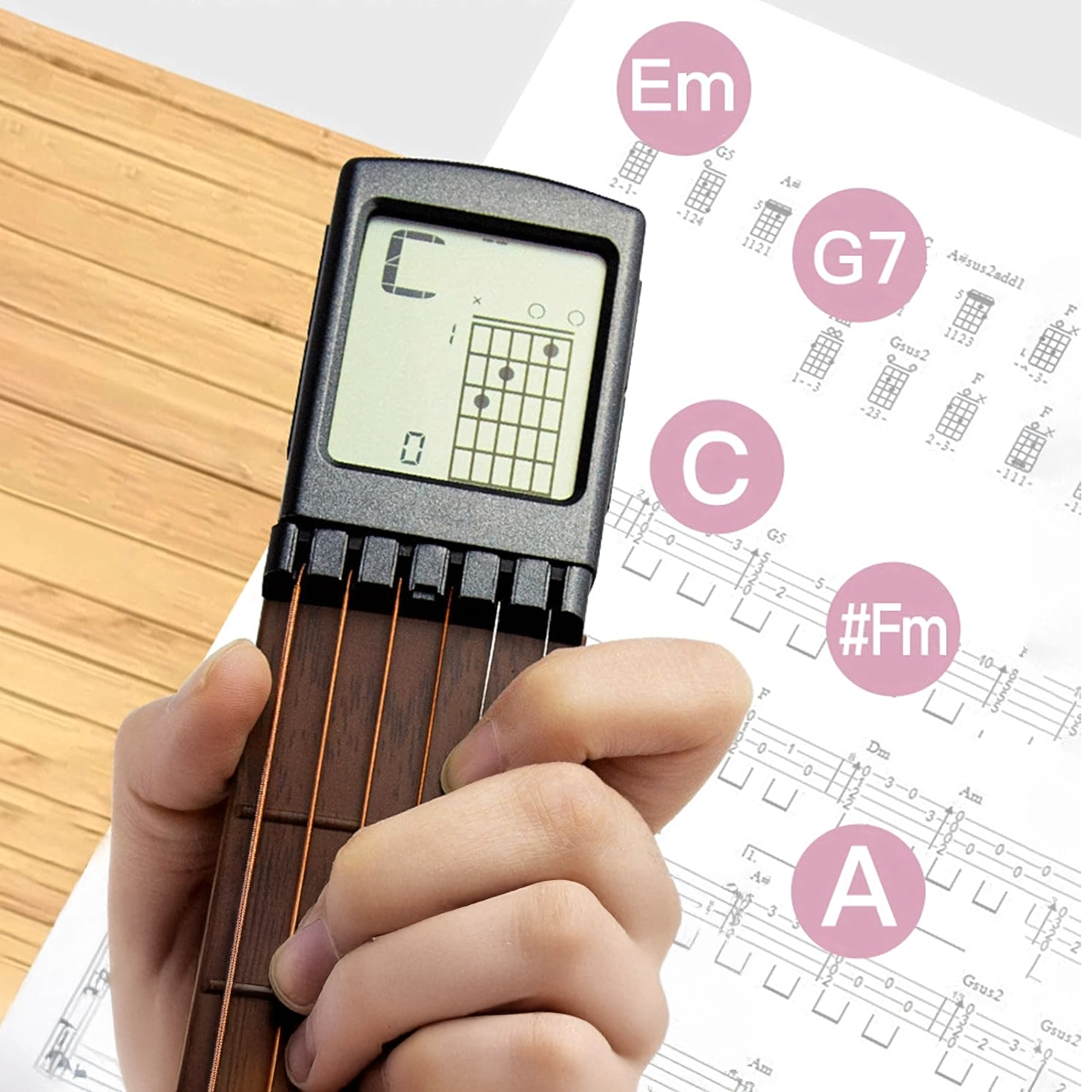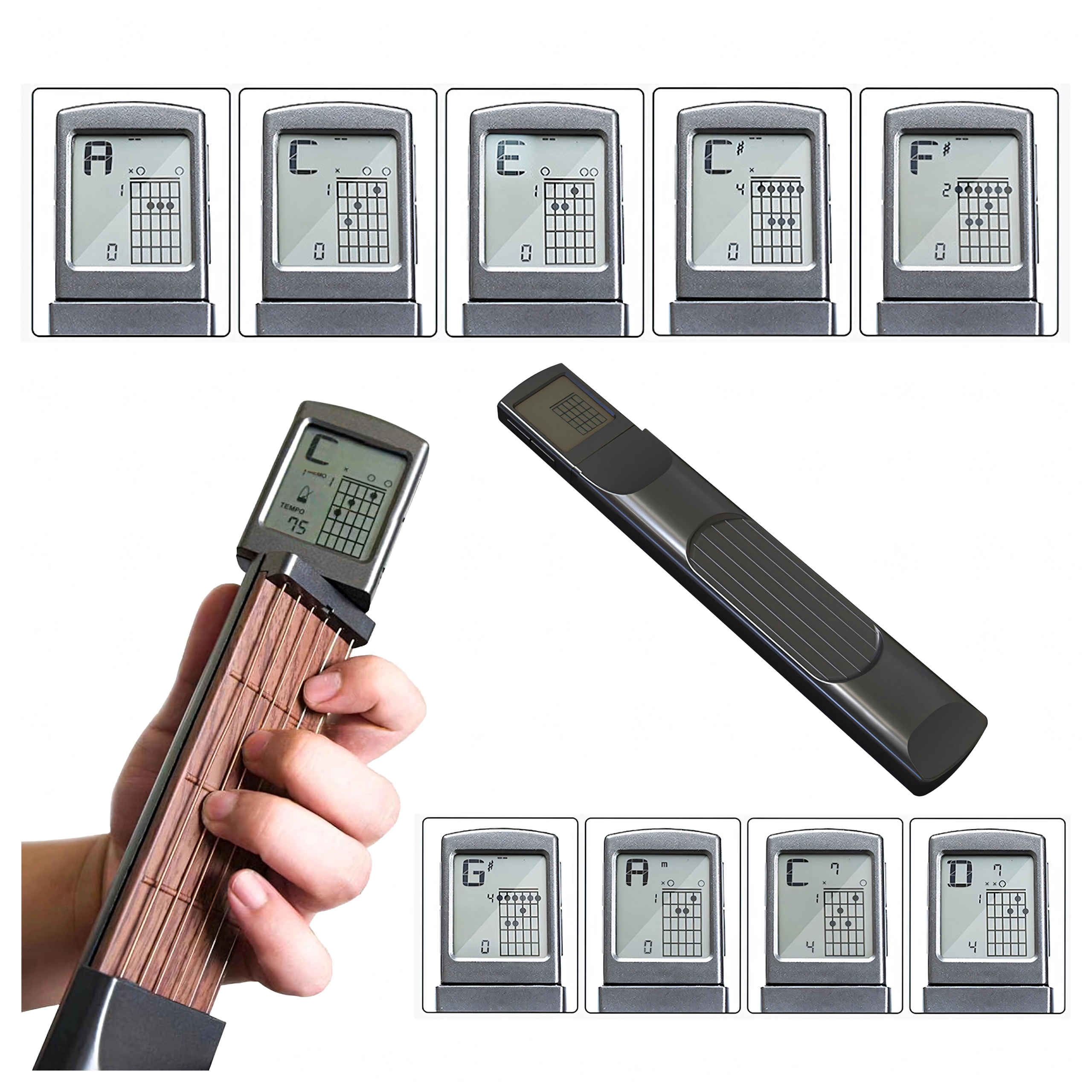 Practice chords, fingering, and chord transitions without disturbing your surroundings. The portable practice fretboard with a short scale simulates a real playing feel thanks to its steel strings, while the LCD display shows chord diagrams, metronome tempo, and helpful indicators for quick learning.