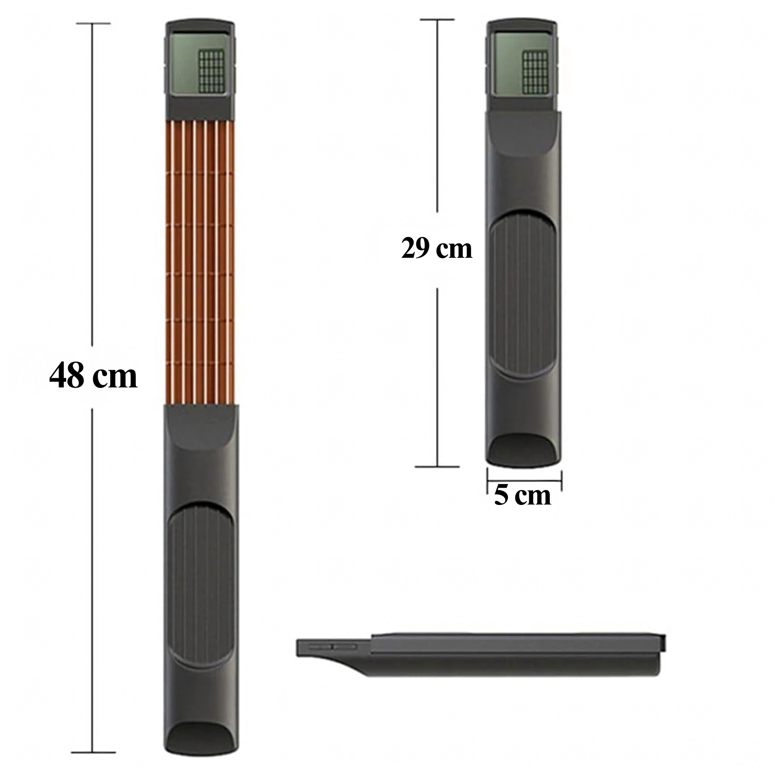 Thanks to its compact dimensions, sliding protective cover, and included case, the device is ideal for travel, school, and work. The built-in metronome supports precise rhythm training, and the tuner/indicators on the display make correct setup easier. A great choice for beginners, self-learners, and guitarists who want to keep their fingers in shape.