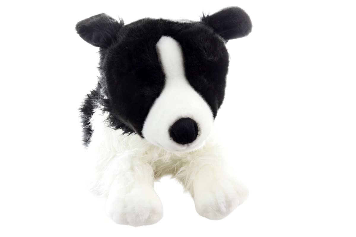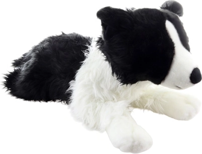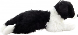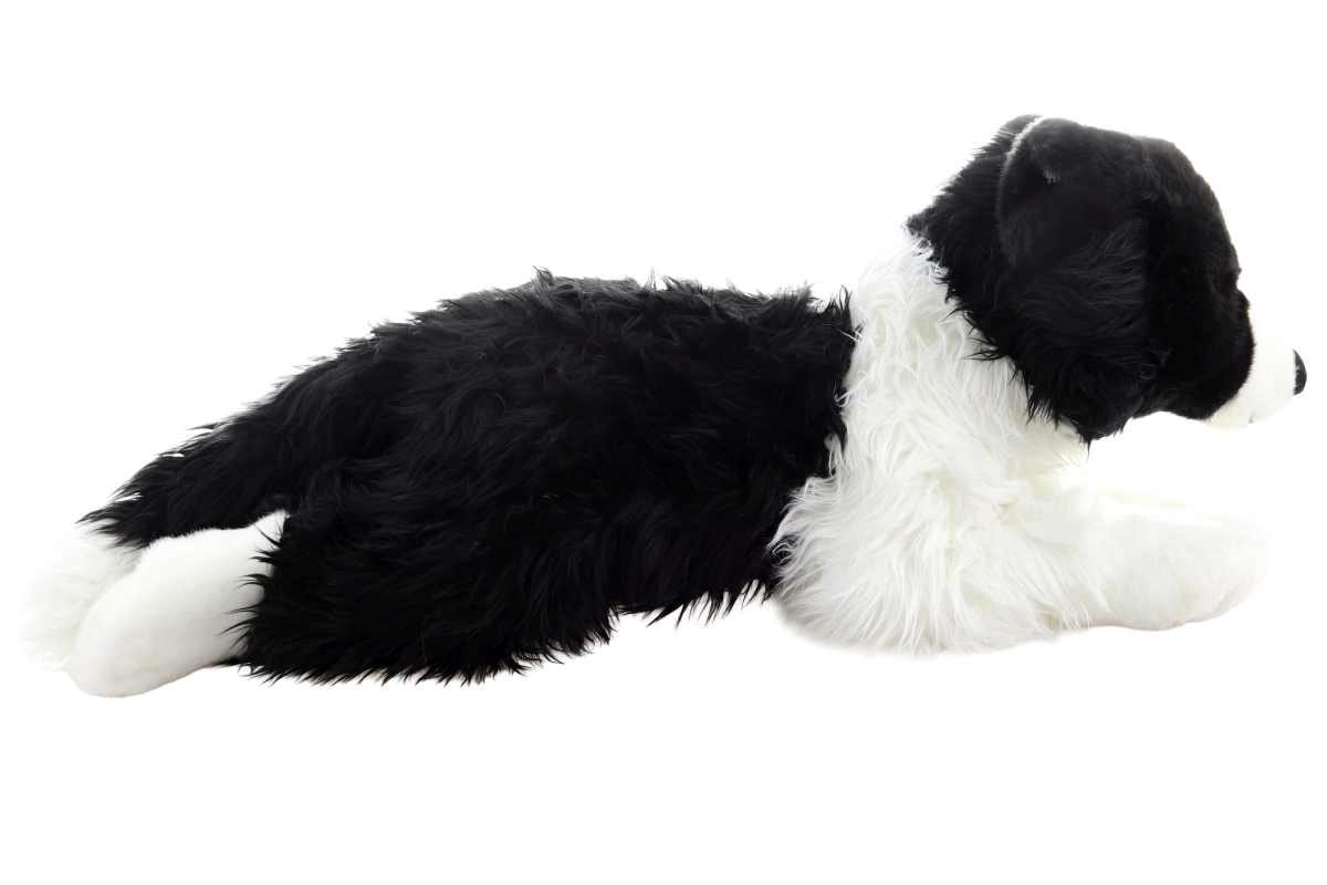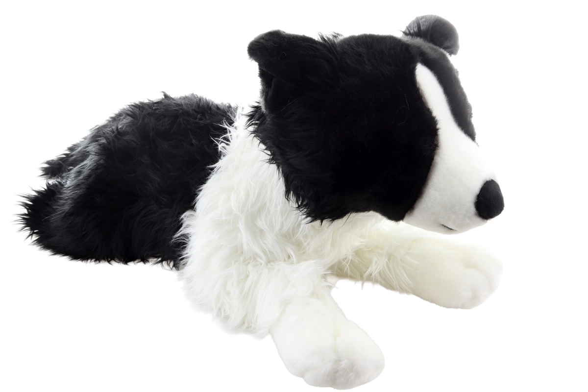 This large plush Border Collie in a lying position delights at first touch. It is made from a very soft, pleasant-to-touch material that invites hugging and cuddling. The realistic mix of black and white fur and cute ears give the toy an authentic look.