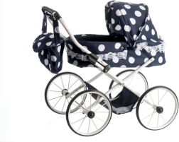 A stylish retro doll pram that will delight every little caregiver. It features black styling with polka dots and elegant lace, a 55 cm adjustable handle for comfortable pushing, and a foldable canopy for easy handling. Includes a handlebar bag and a practical lower basket for small items.