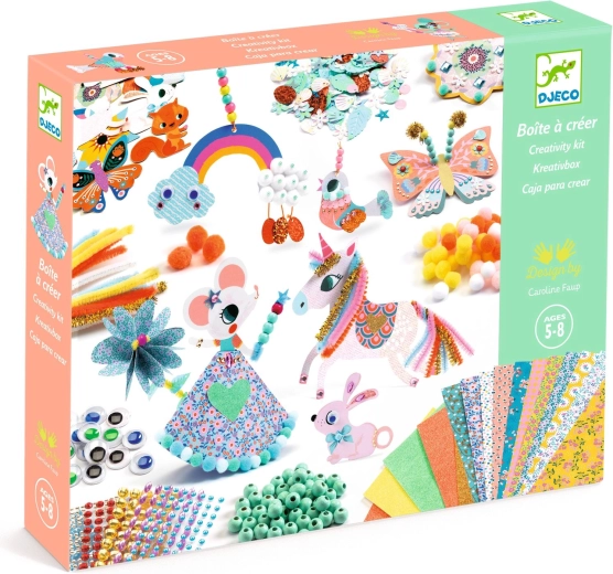 Discover the joy of creating with DJECO’s two-tier creative box, packed with colorful materials and ideas. This great set for kids supports fine motor skills, imagination, and creative expression through various techniques—from gluing and decorating to threading and collages.