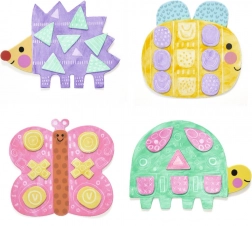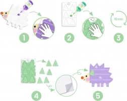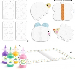 The set includes sturdy templates of cute animals and easily washable paints. Children can apply paint, let it dry briefly, and finish the picture by sticking or placing pieces according to the guide. A great activity for developing fine motor skills, sensory perception, and creativity.