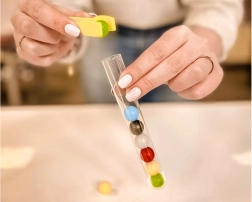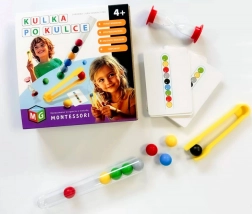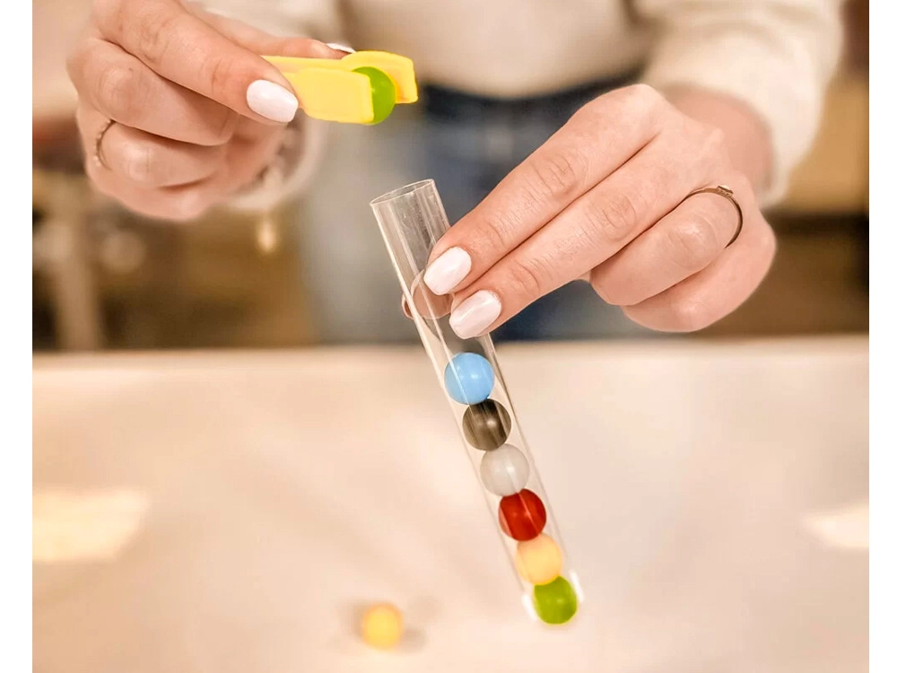 This original educational game inspired by the MONTESSORI method supports learning through action. Children grasp colored beads with tweezers and place them into a test tube, either freely or according to pattern cards. This trains precision of movement, patience, and visual-motor coordination.