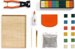 - Colorful mosaic tiles, glue with applicator, mixing powder/grout, scraper, brush, wooden base/frame, positioning stick, pliers for trimming pieces