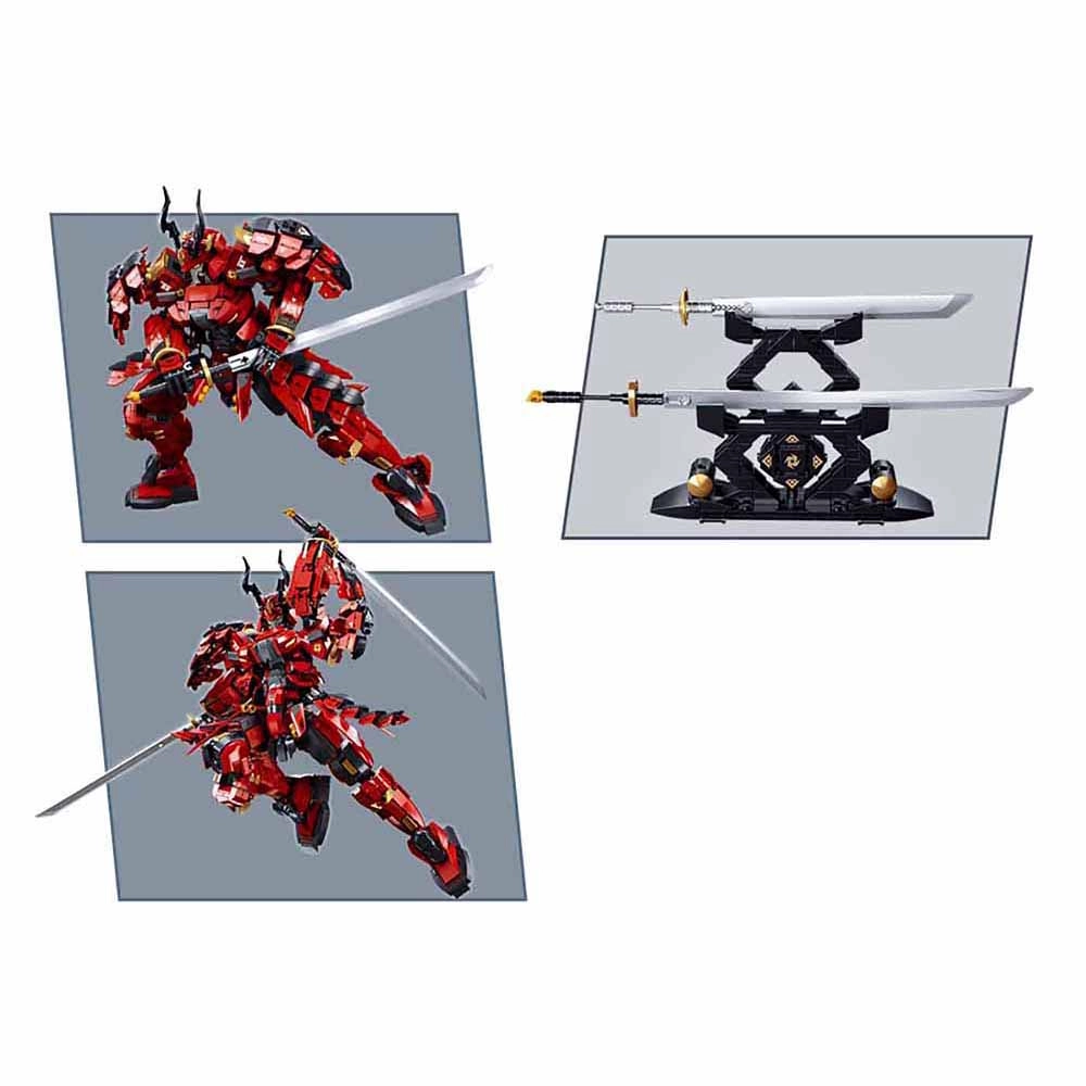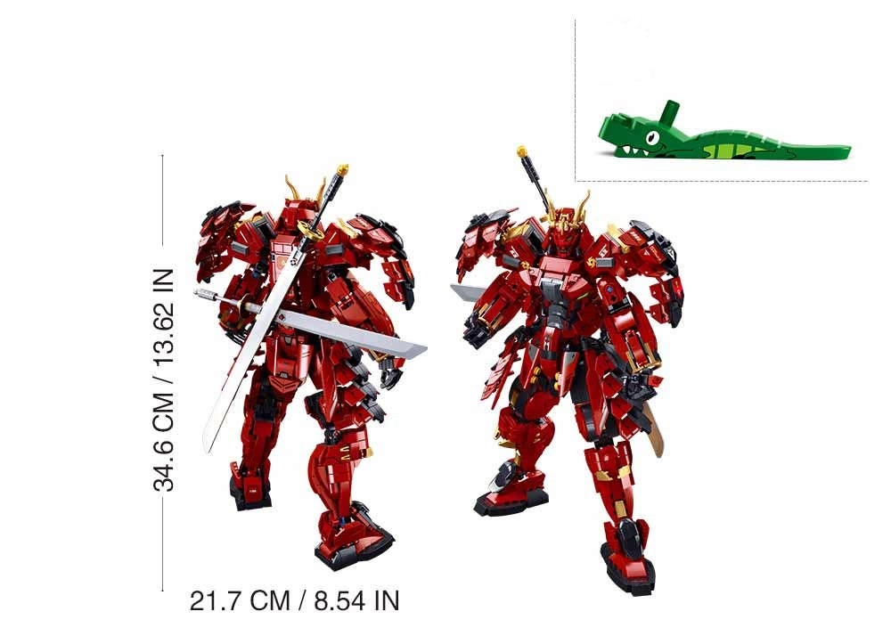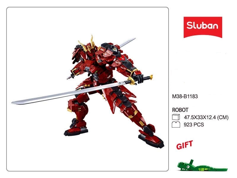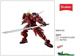 Dive into a world of action-packed battles with the Sluban Robot Samurai building set. This impressive red mecha warrior has articulated arms, legs, and head, wears finely detailed armor with gold accents, and is armed with two katanas. Made from high-quality ABS plastic, the set includes 923 pieces, offers a great building experience, and is compatible with LEGO and other brands.