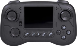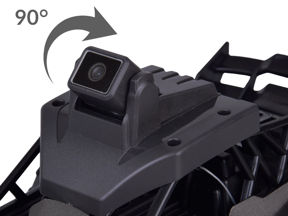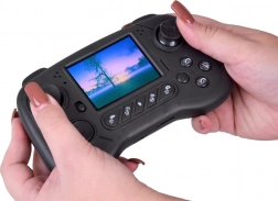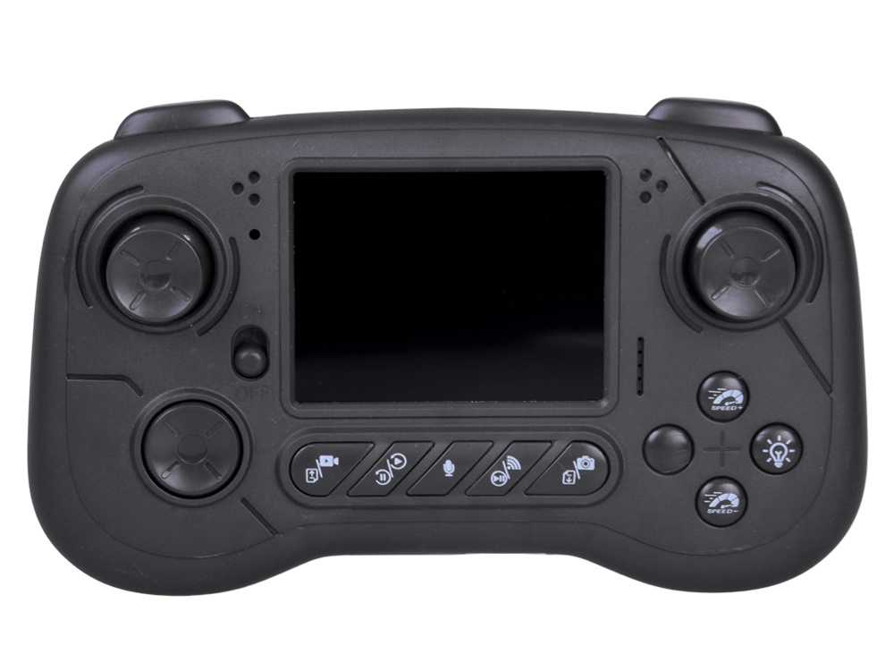 An ergonomic controller with a display provides a clear live preview, 2 speeds, steering control, lights, and one-touch triggers for photo/video and voice communication.