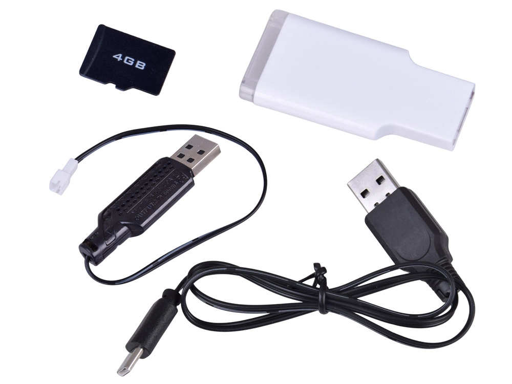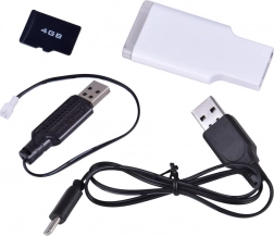 RC car, controller with display and joysticks, USB cable for car, USB cable for controller, 4 GB microSD card with reader, screwdriver