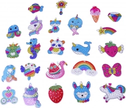 Watercolor-style acrylic designs—animals, fruit, rainbows, and unicorns. Kids create their own dazzling accessories for keys or a backpack.
