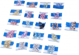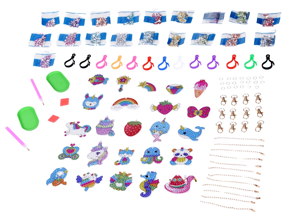- 24 acrylic keychains to decorate with gems, 12 metal ball chains, 12 plastic clips/keyrings, 2 sorting trays, 2 wax pads, 2 applicator pens, over 3000 colorful gems