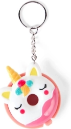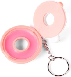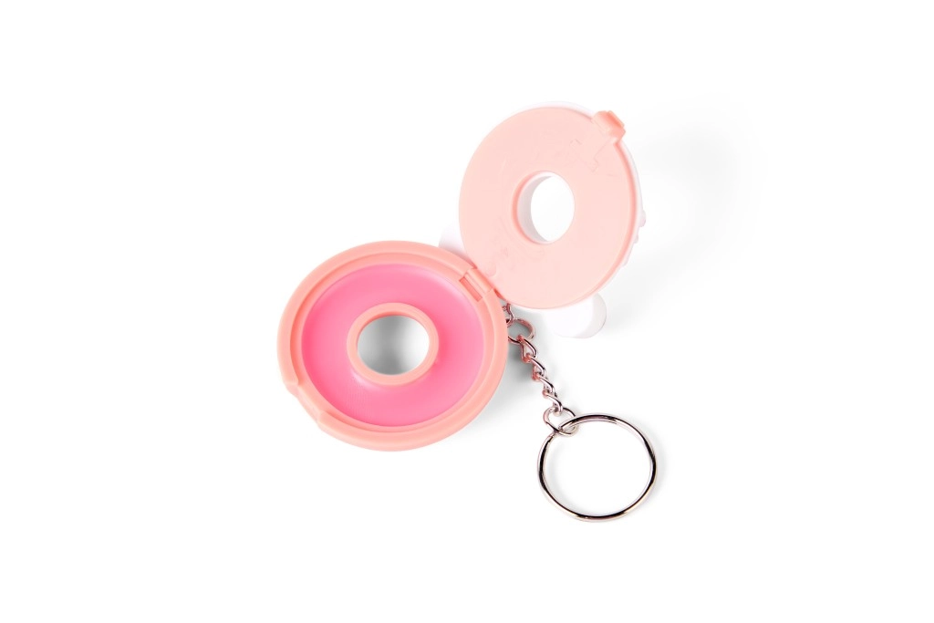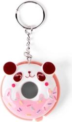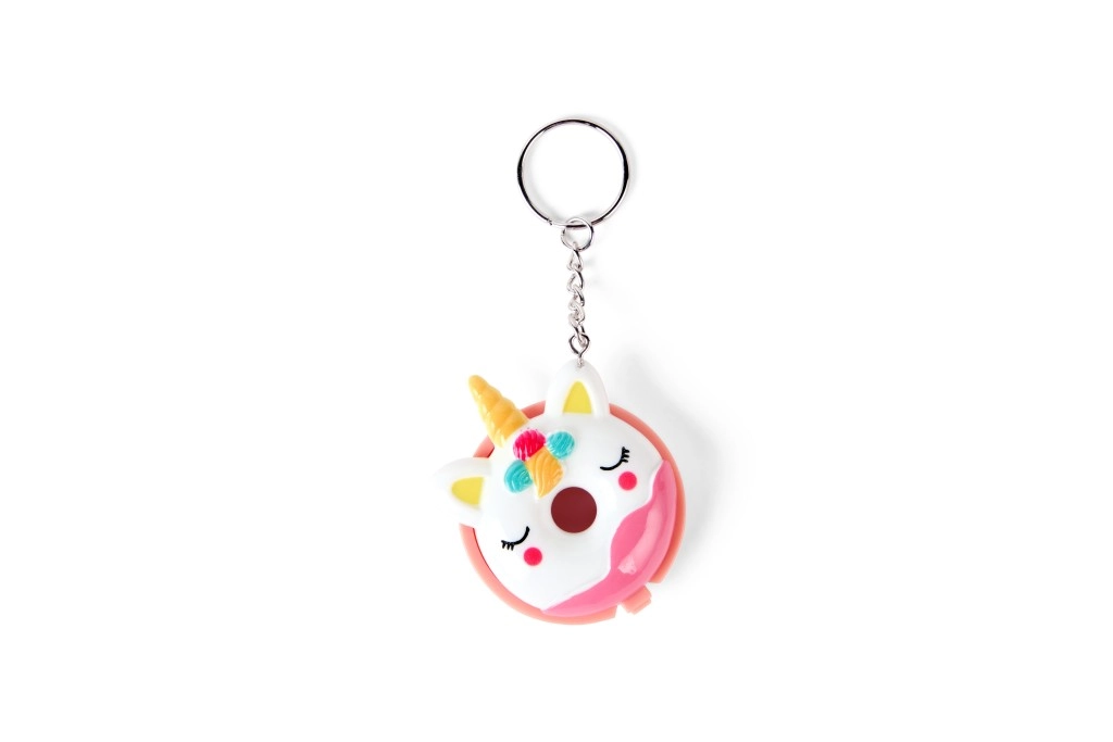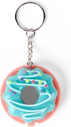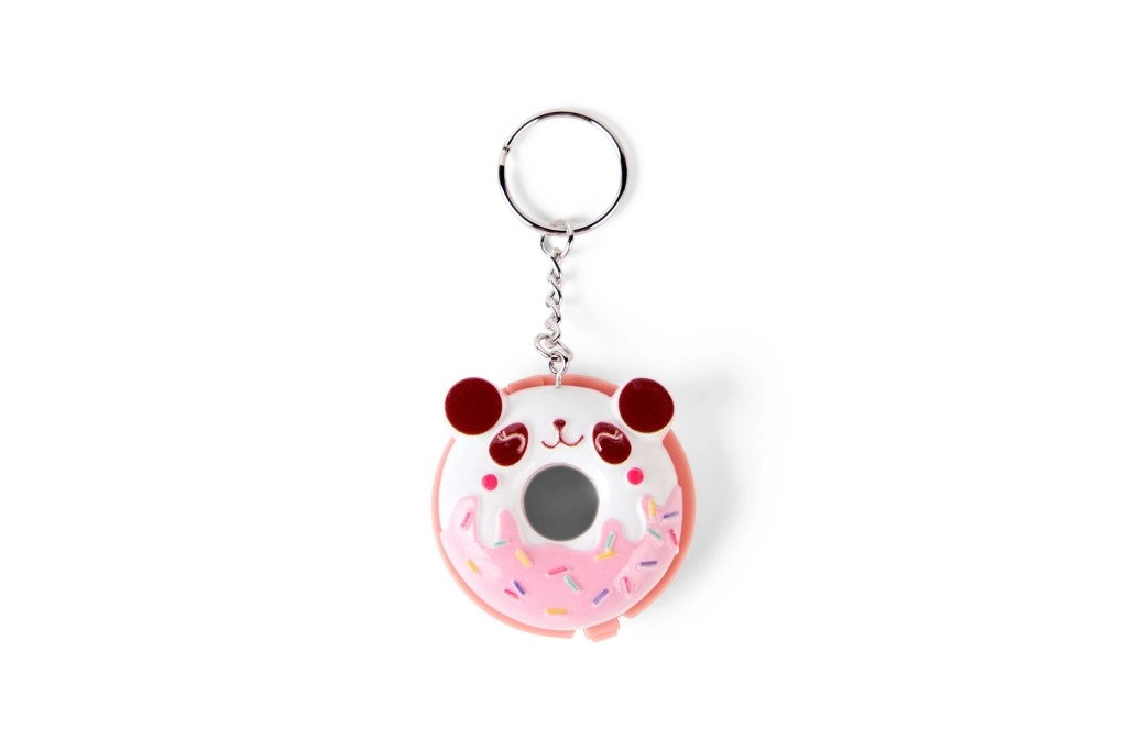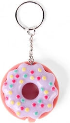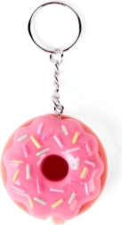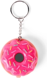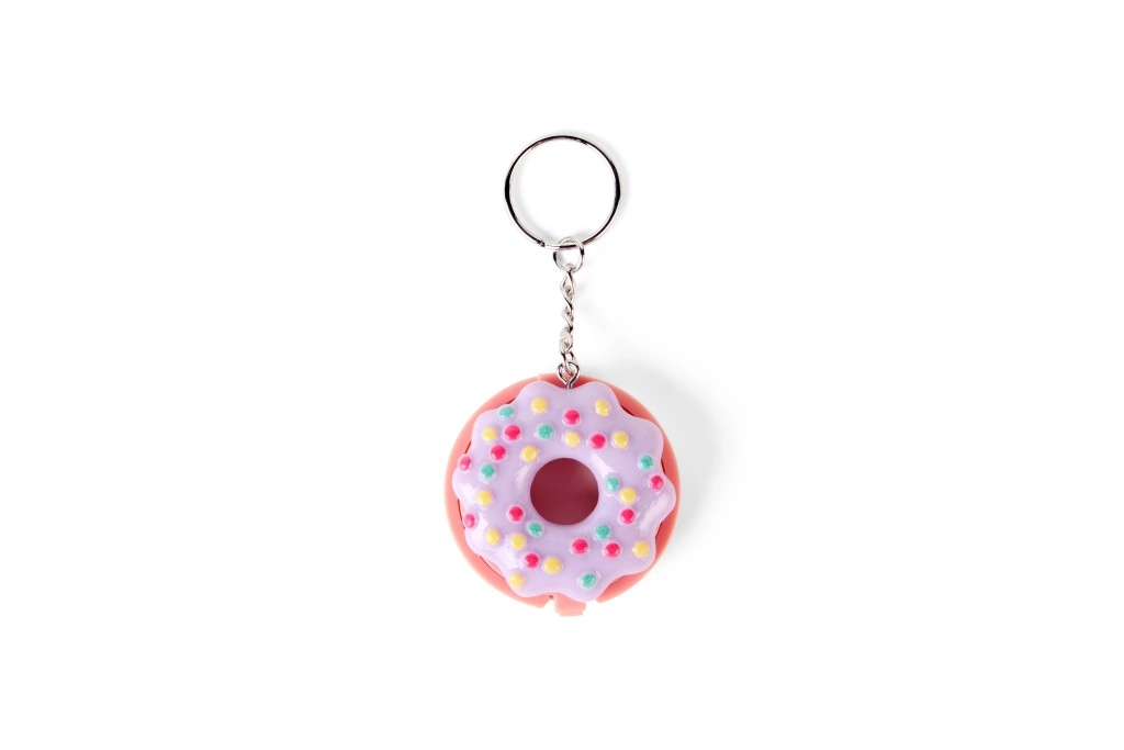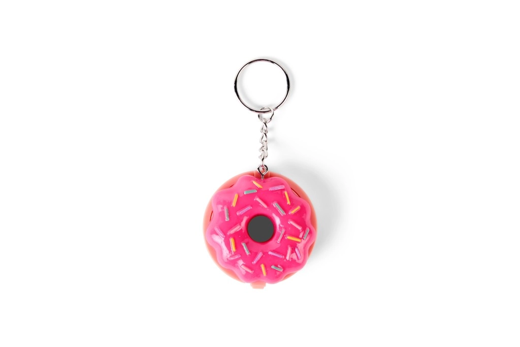 Compact pink donut-shaped packaging with colorful sprinkles and a metal keyring for easy attachment to a backpack or keys.