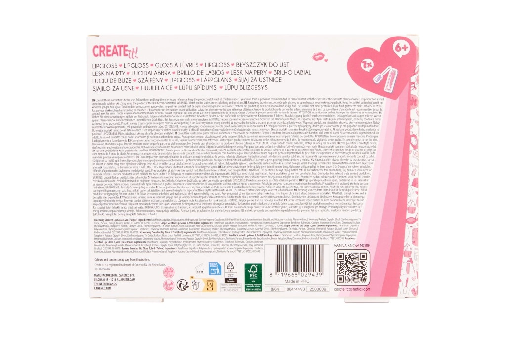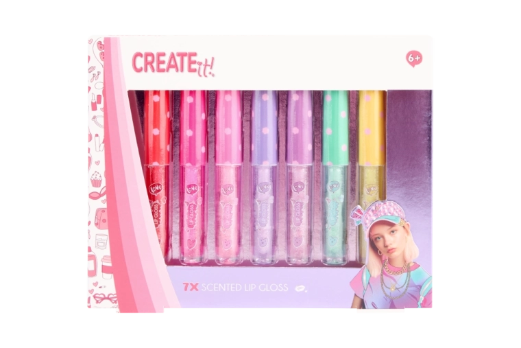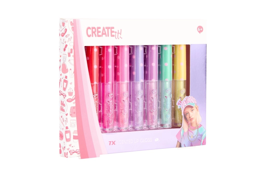 Discover the playful set of 7 scented lip glosses from CREATE IT!, giving your lips a radiant shine, delicate sparkle, and a pleasant fragrance. Each tube has a different shade and aroma, so you can easily choose the color for any mood. Perfect as a gift or for sharing with friends.