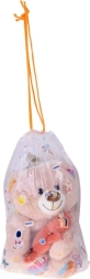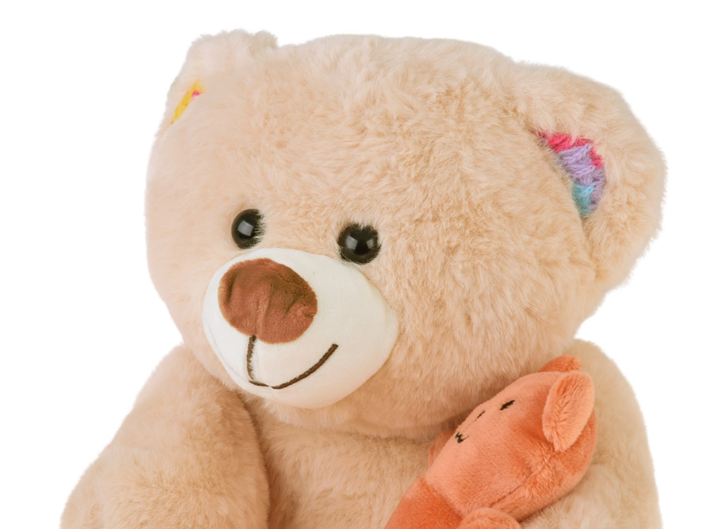 Beige teddy with colorful details on paws and ears, includes a small orange teddy