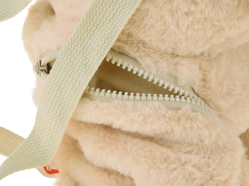 This cuddly beige teddy-bear backpack blends a toy with a practical carryall in one. Colorful details on the paws and ears, an embroidered smile, and a cozy furry surface spark kids’ imagination while making it comfy to wear. The hidden zip pocket holds small treasures, a snack, or tissues.