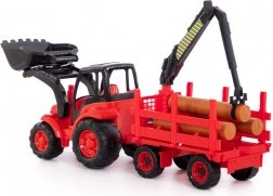 This colorful tractor with large wheels and a log trailer is perfect for creative play at home and on the playground. Children can use the movable front bucket to scoop materials and the crane with grab on the trailer to lift and load wooden logs. The durable plastic design ensures long life and safe play.