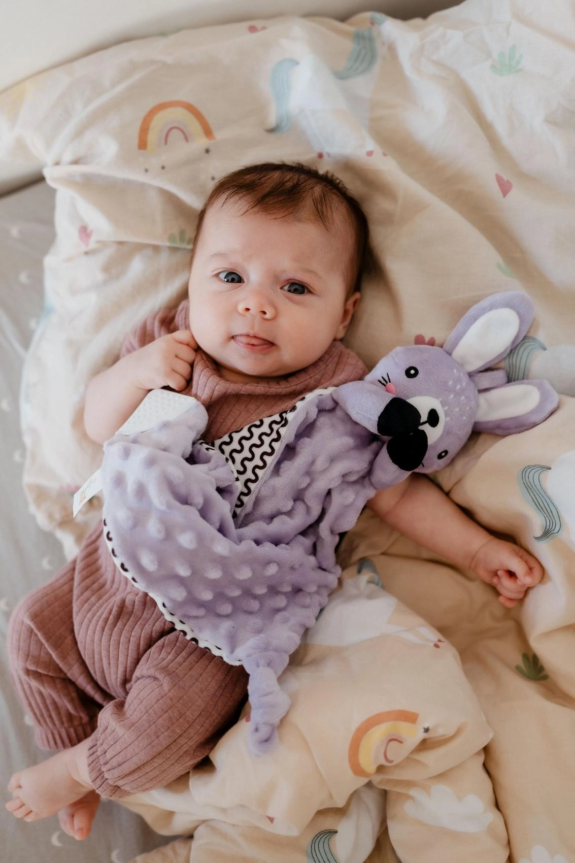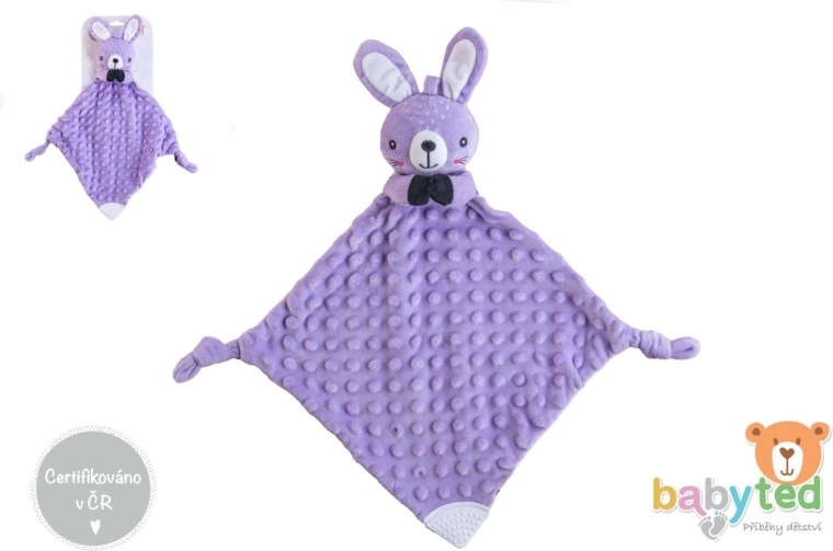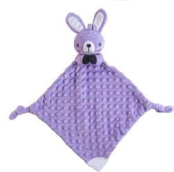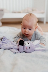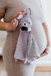 This soft plush bunny comforter is an ideal first companion for babies. The minky fabric with molded 3D dots provides pleasant tactile stimulation, calms, and helps create a sense of security during naps and nighttime. Thanks to its lightweight design, even tiny hands can grip it easily.
