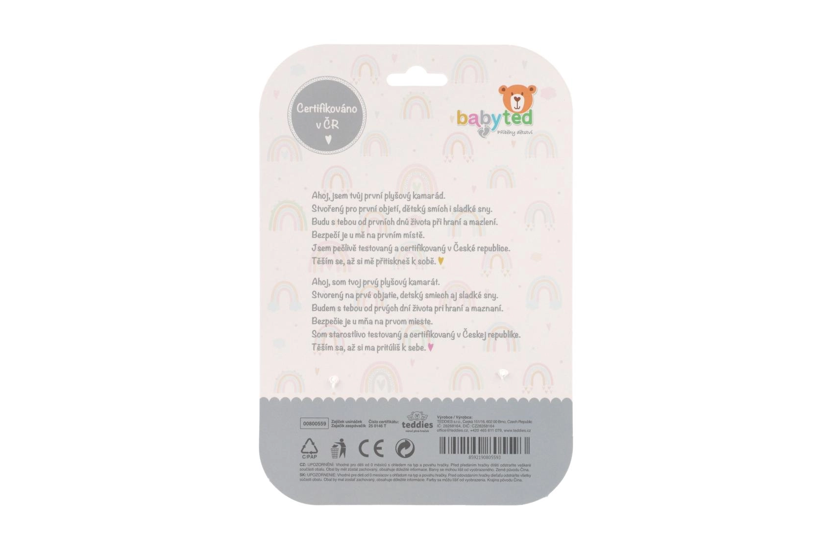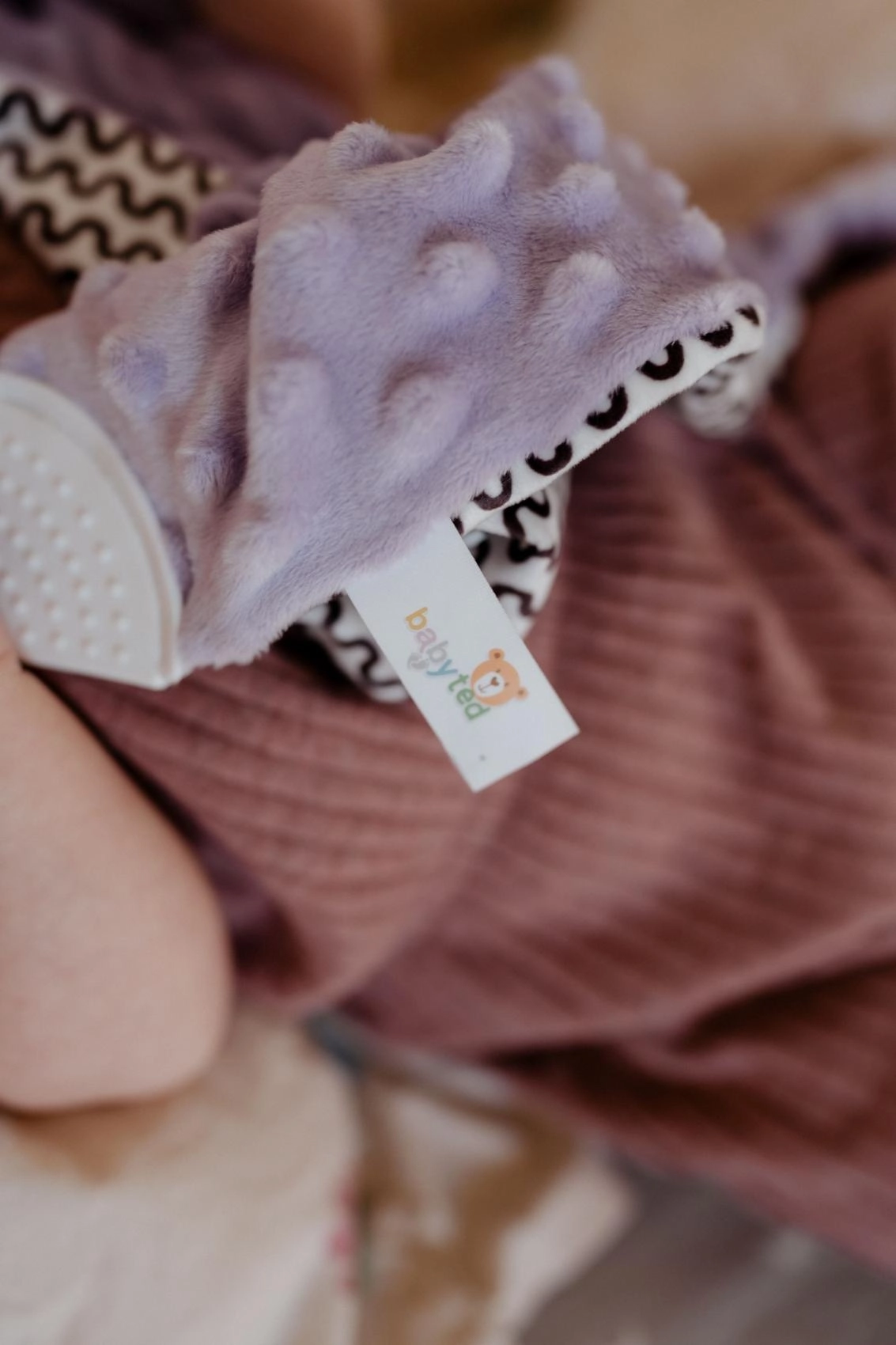 Inside is a gentle rattle to support hearing development, one corner features a soft silicone teether to relieve sore gums, and the knotted corners promote fine motor skills. The practical 25 × 25 cm size fits perfectly in a crib, stroller, or car seat.