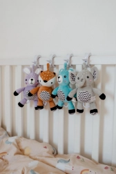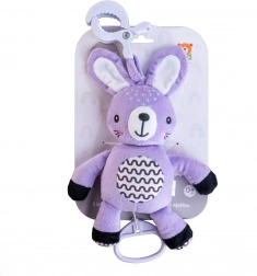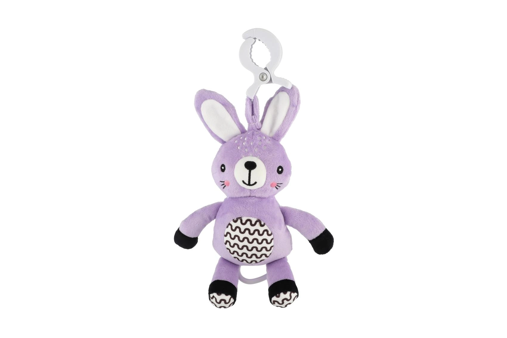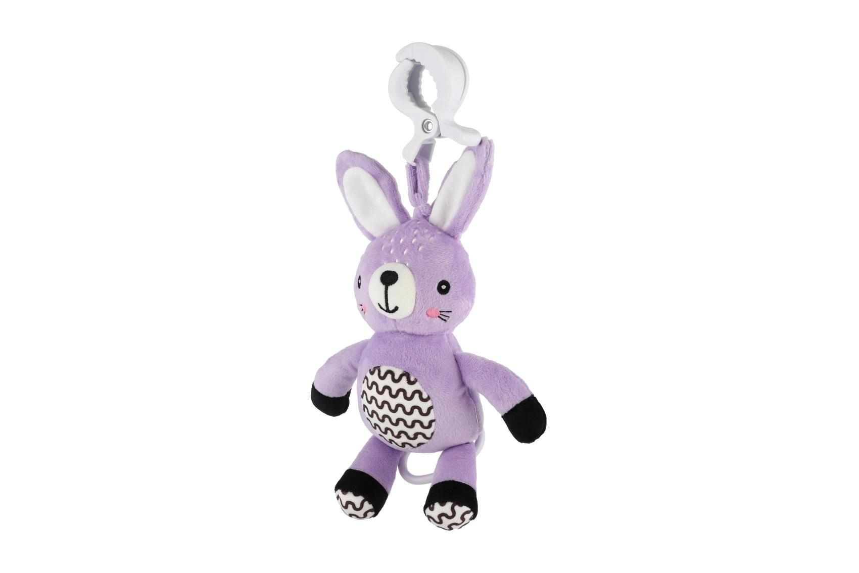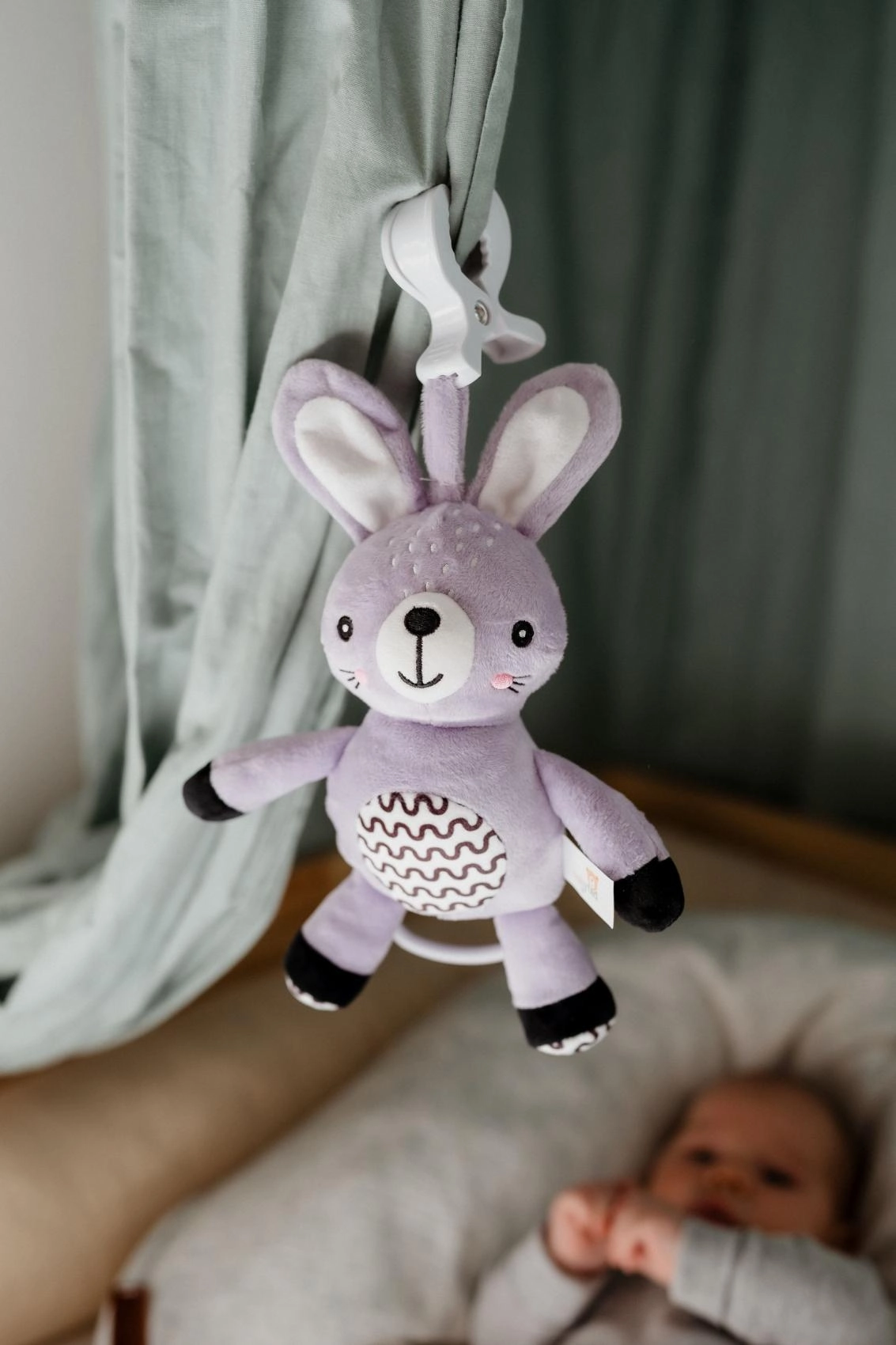 This hanging plush bunny brings comfort, gentle stimulation, and safe fun at home and on the go. After pulling, the wind-up mechanism plays a pleasant melody that helps create a calm environment for rest. Thanks to the universal clip, you can easily attach the toy to a stroller, crib, car seat, or play gym.