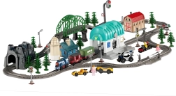 Electric locomotive, freight cars, tracks and switches, bridge, tunnel, station, 4 cars, 4 figures, trees, traffic signs, buildings and decorations, barriers, signals, manual