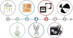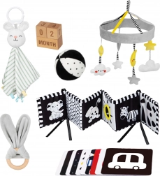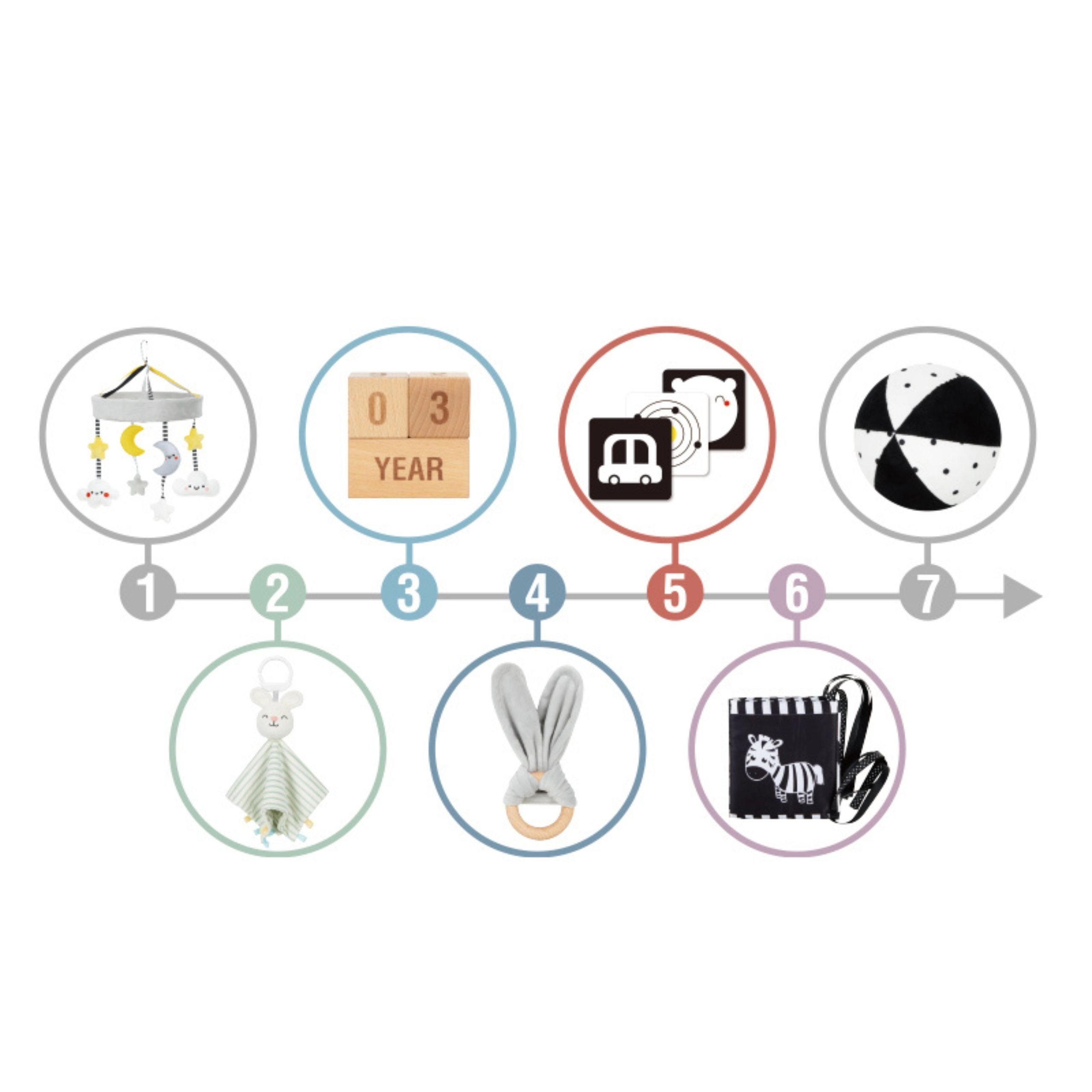- hanging mobile, contrast cards, soft ball, plush bunny, crinkle contrast soft book, wooden “Bunny” teether, wooden milestone blocks