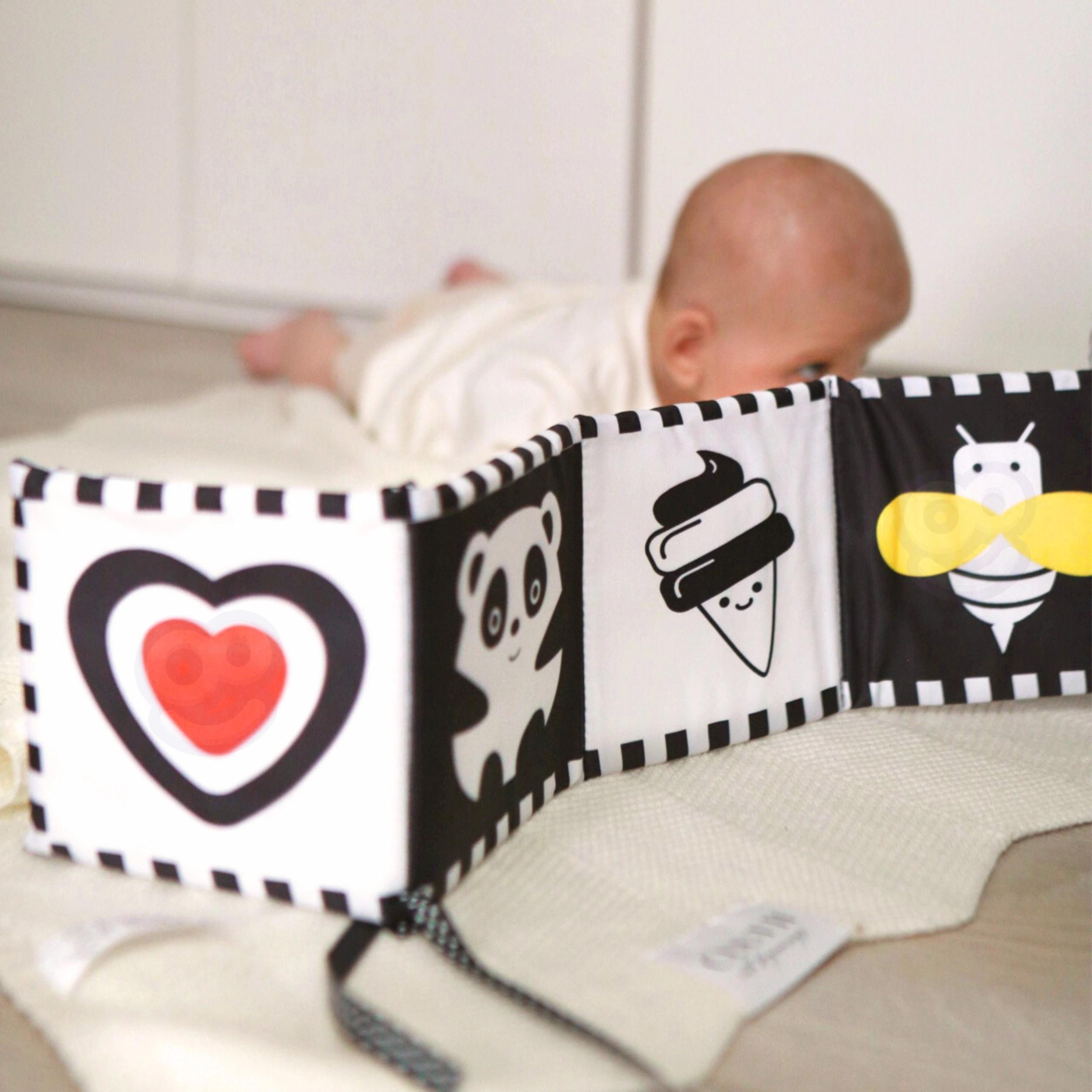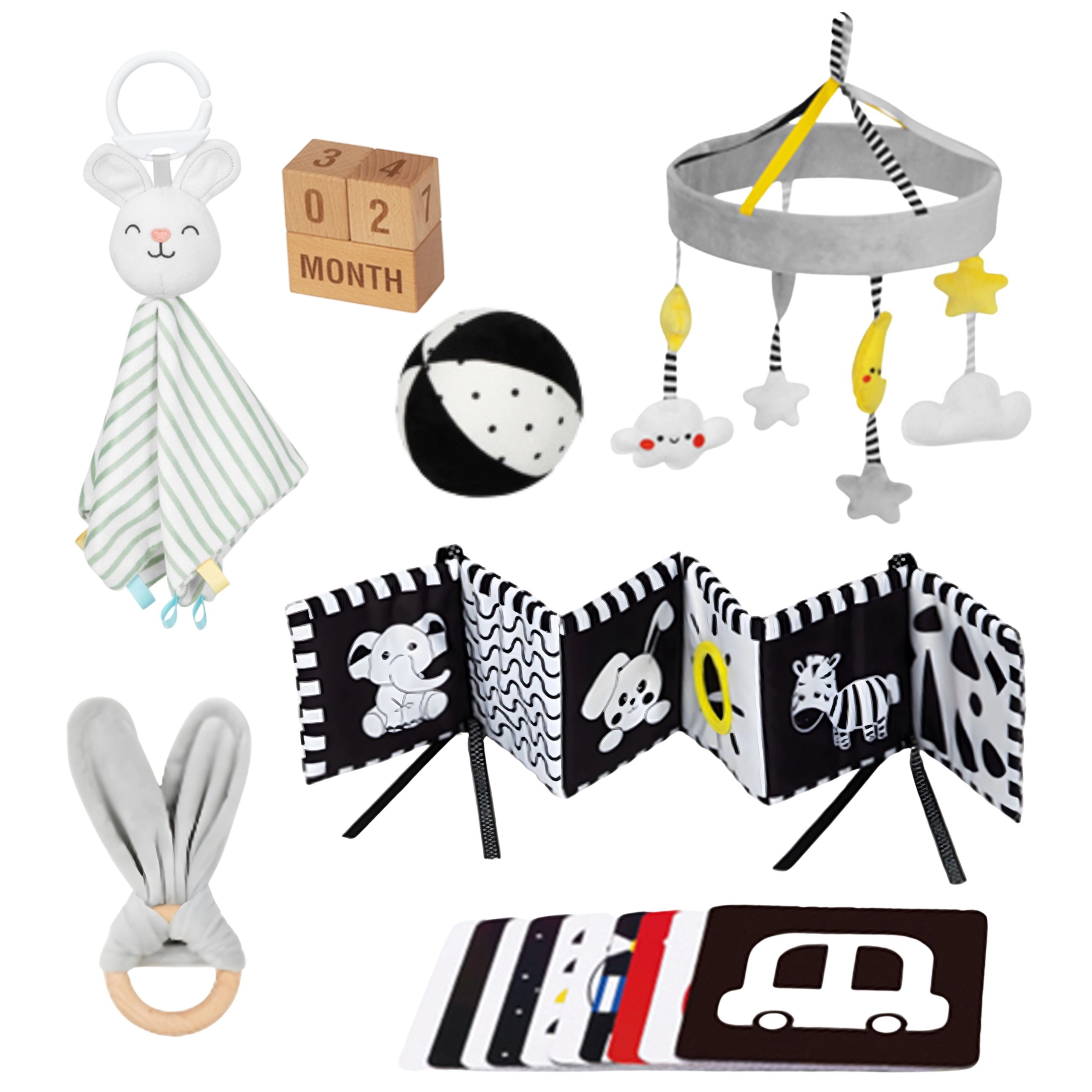 Black-and-white patterns on the cards, soft book, and panel naturally catch a newborn’s eye, support early focusing, and extend attention time during tummy time.