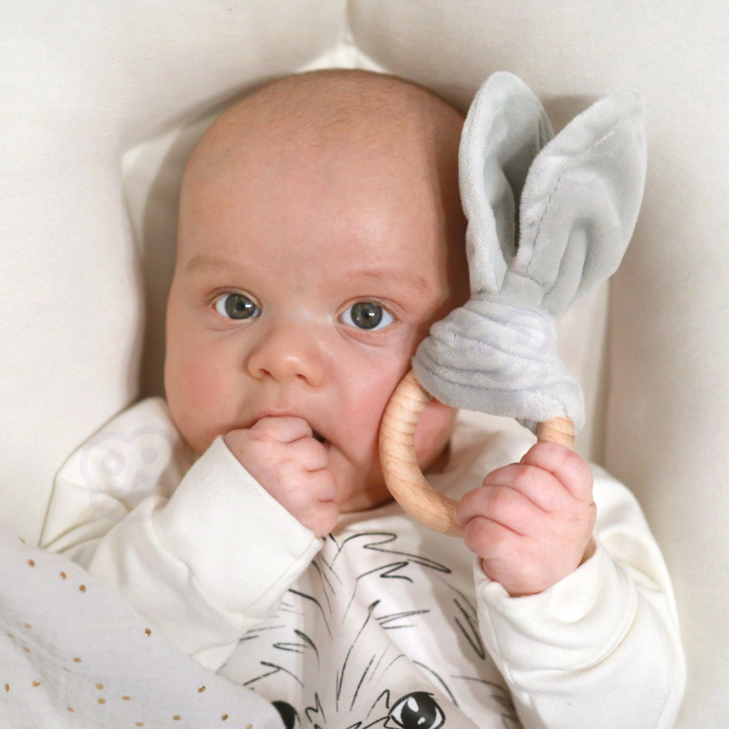 A wooden teether with fabric “ears” is easy for the tiniest hands to hold, helps during teething, and supports hand–eye coordination.