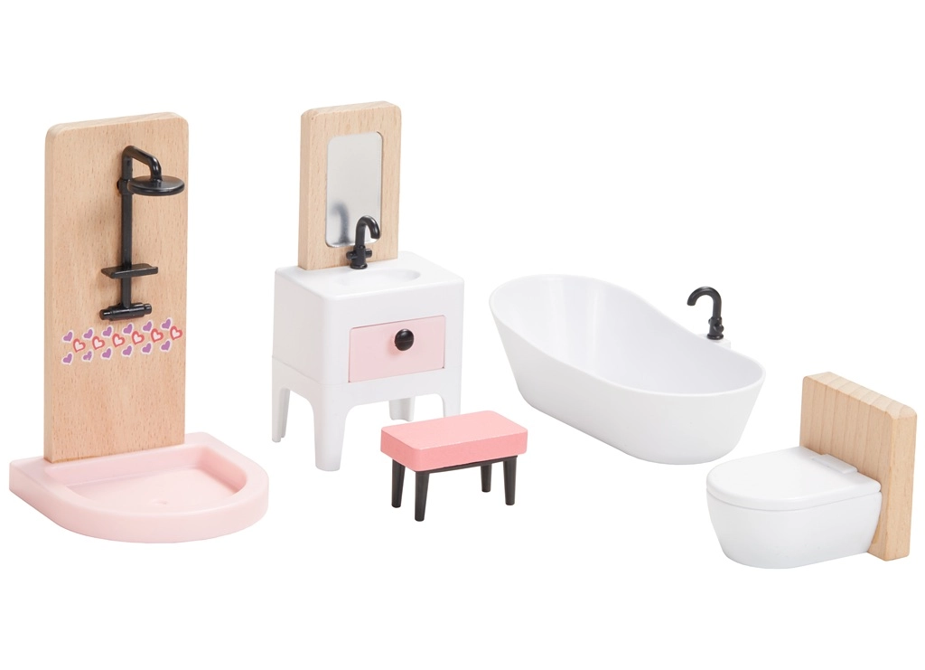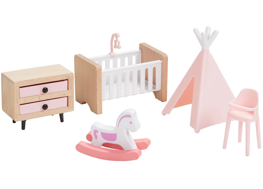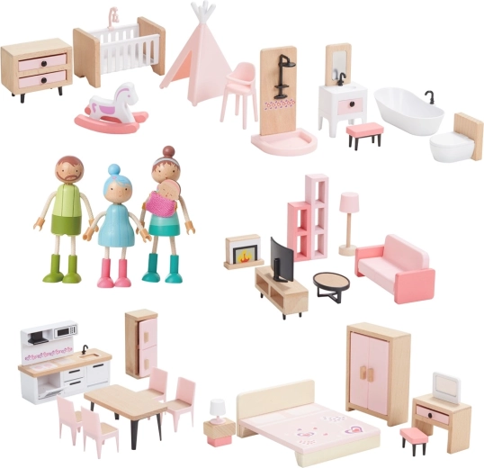 The 5‑in‑1 set equips the bedroom, kitchen, living room, bathroom, and kids’ room—just unpack and start playing. The ideal starter set for a first dollhouse.