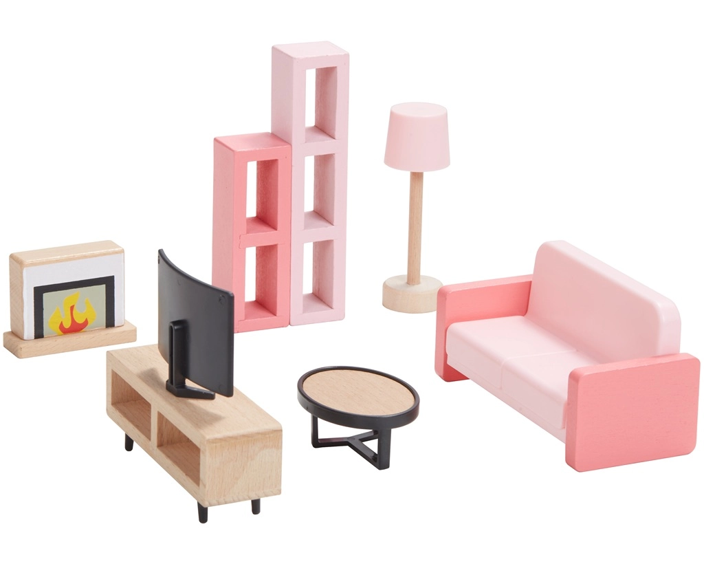 This versatile dollhouse furniture set offers everything kids need to create a cozy home for their figures. It includes furnishings for the bedroom, kitchen, living room, bathroom, and kids’ room in a harmonious blend of natural wood and soft pink accents. A complete family with bendable limbs is also included for authentic scenes and role play.