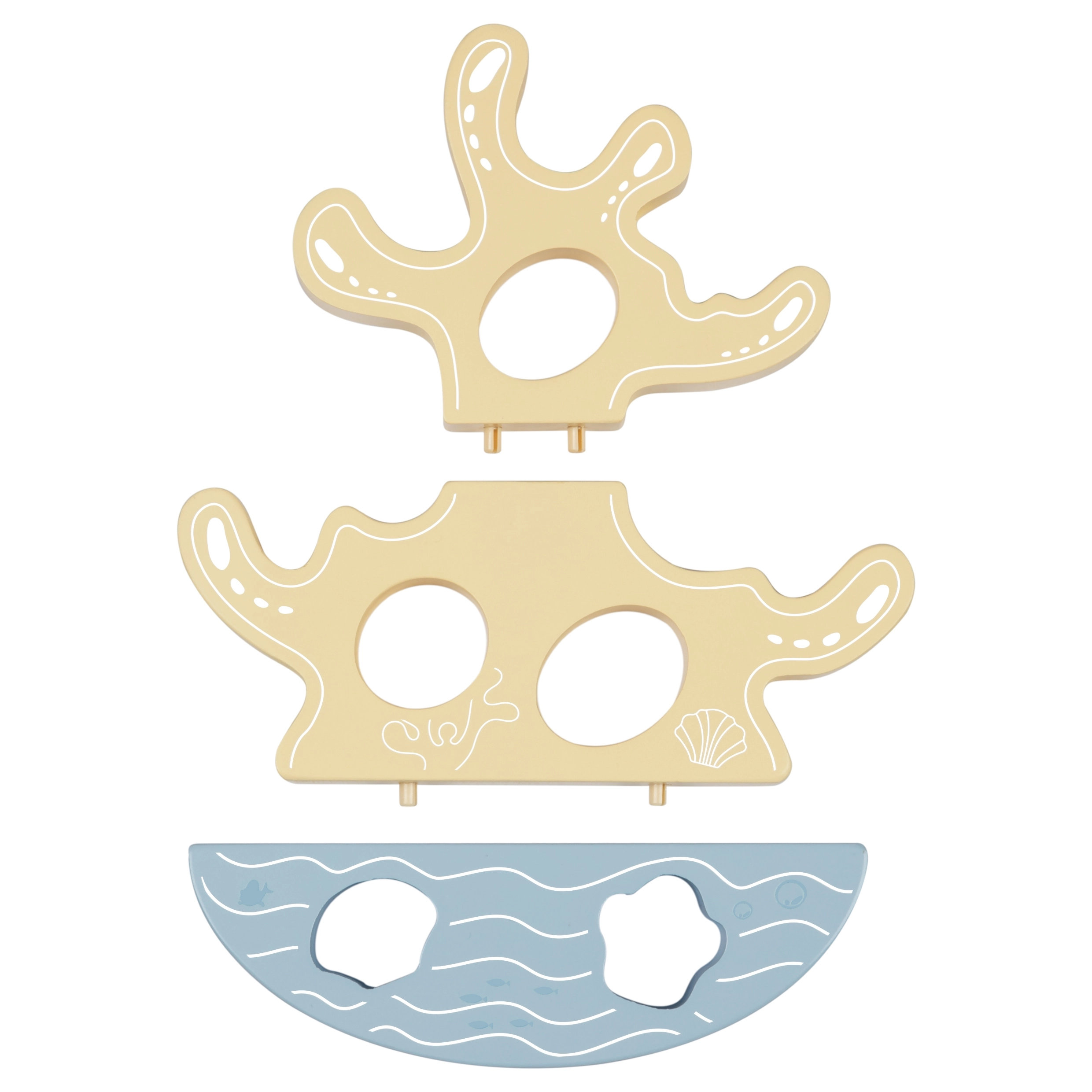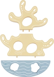 The coral tower on a rocking base invites stacking and balancing. It develops fine motor skills, logic, and spatial perception through play.