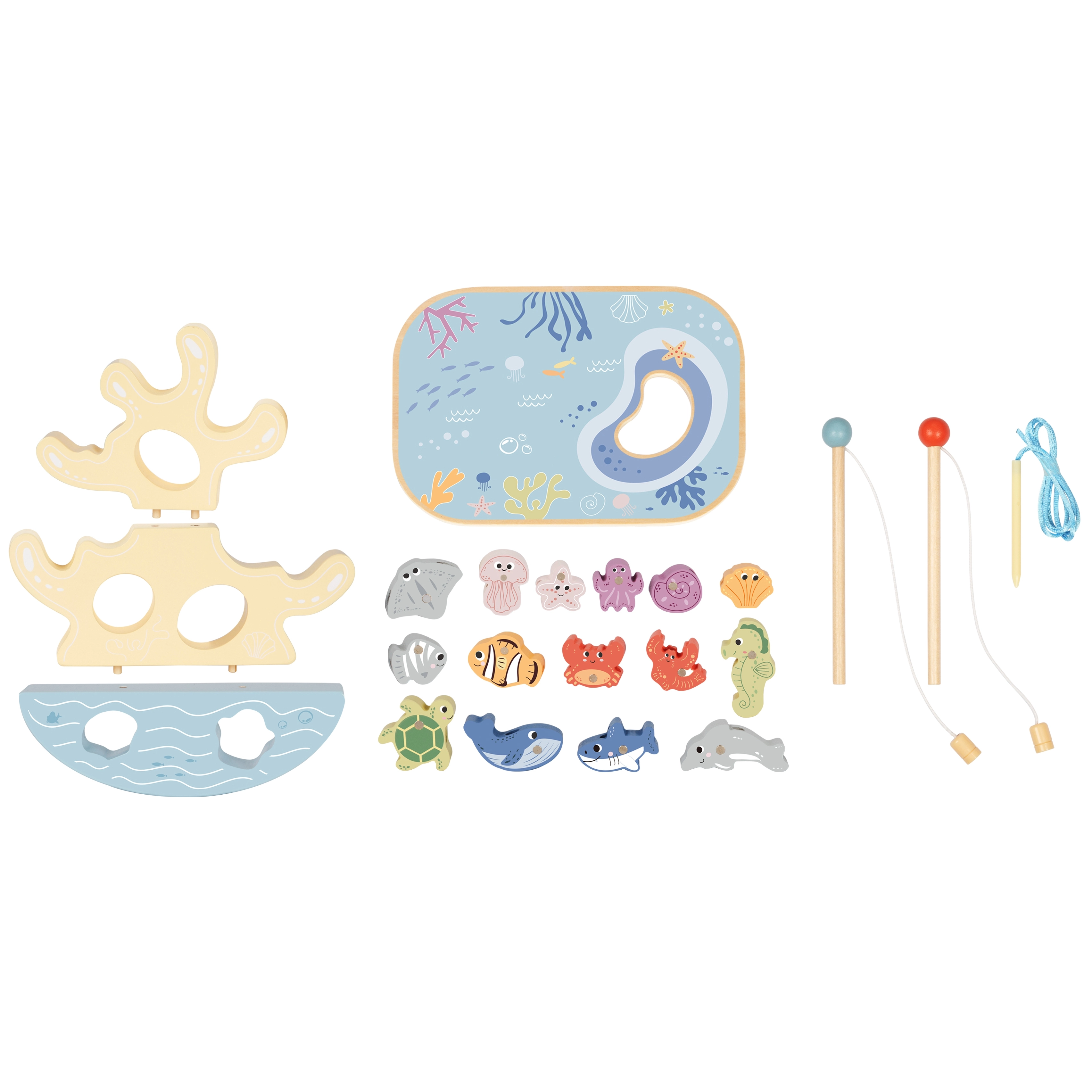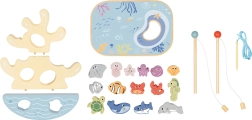 Two wooden rods with magnets and colorful sea creatures turn the table into an ocean. Kids practice accuracy, patience, and hand–eye coordination while catching by shapes and colors.