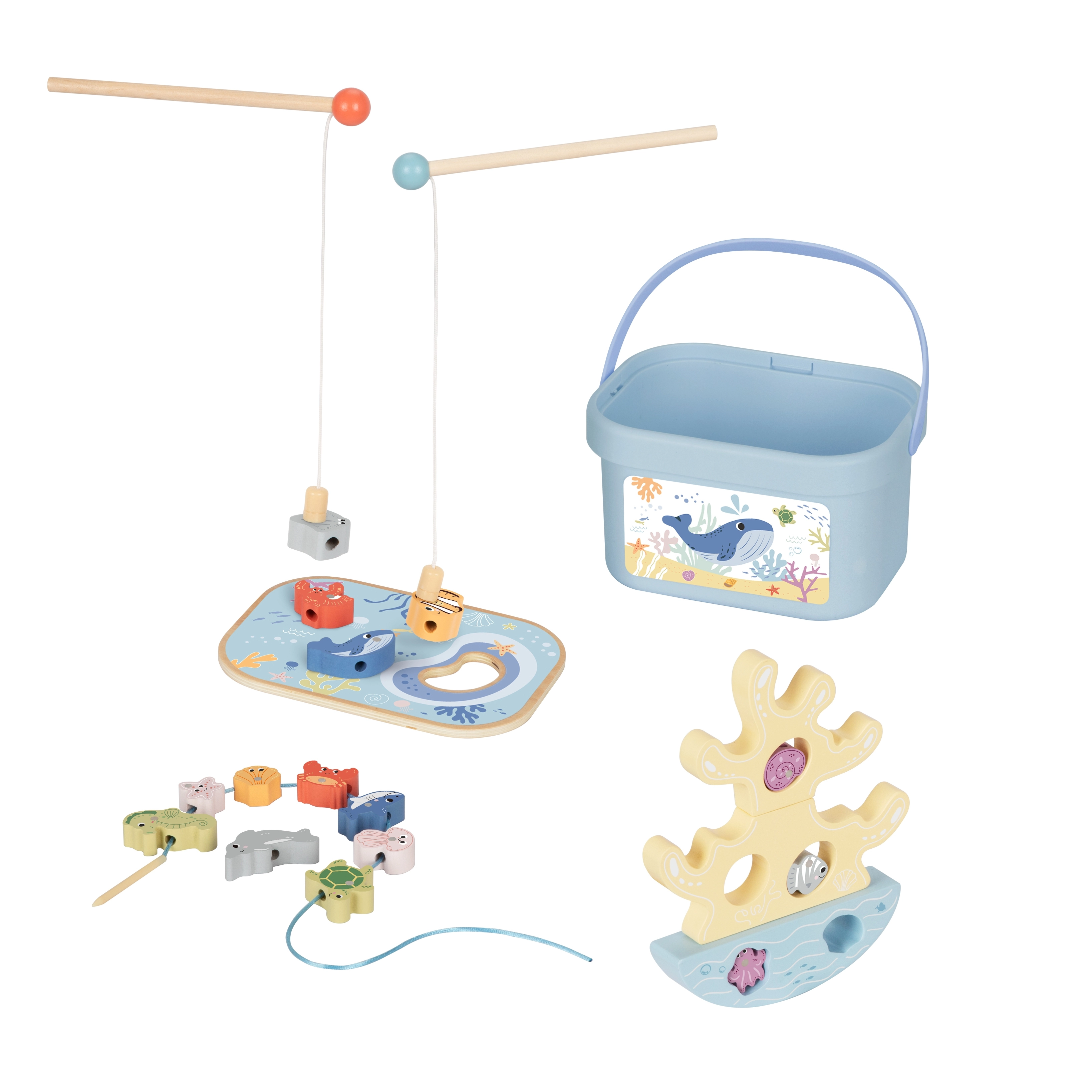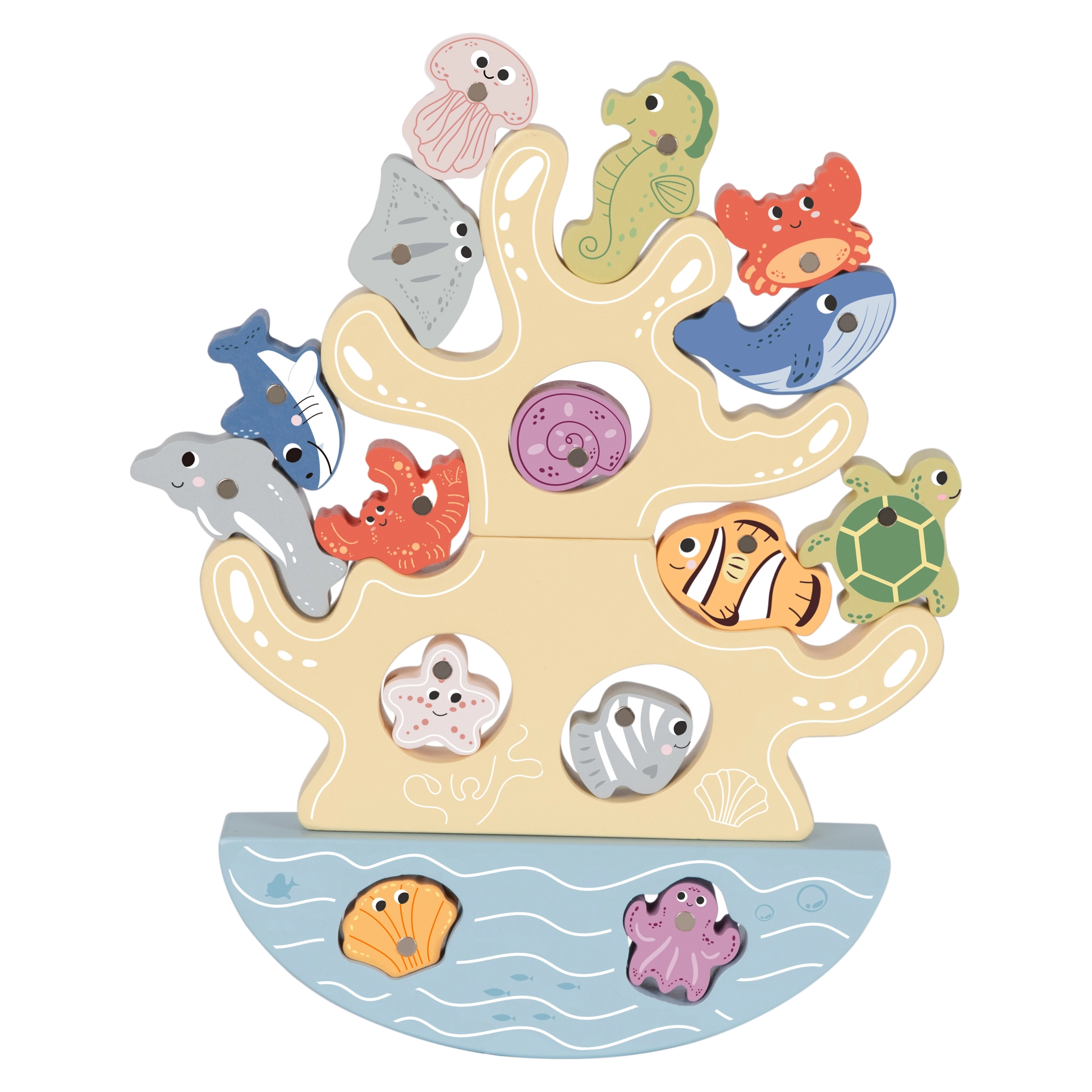 This creative wooden set brings kids a whole ocean of fun in one package. Two magnetic rods invite them to catch colorful fish, the coral balancing tower builds patience and stability, and the lacing cord with a wooden needle develops fine motor skills and concentration. The pieces have pleasantly rounded edges and fit little hands.