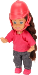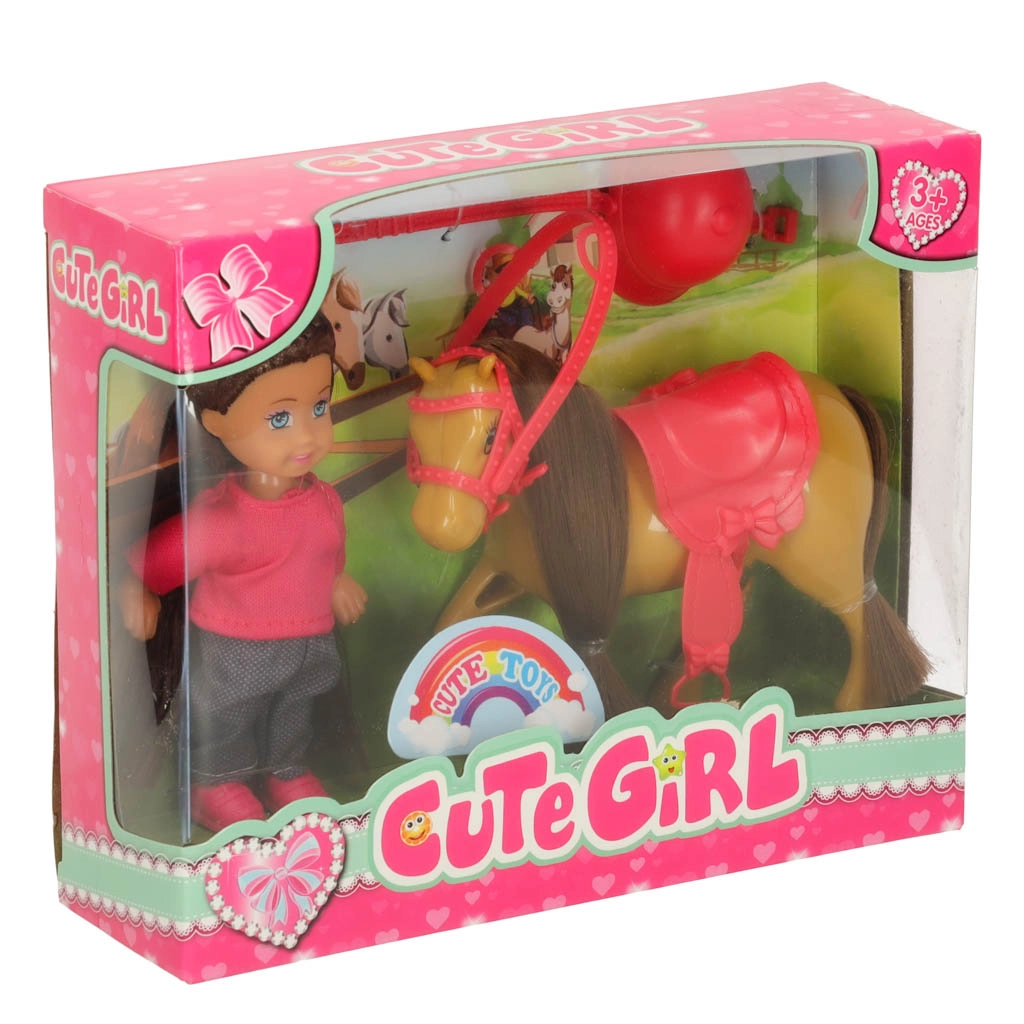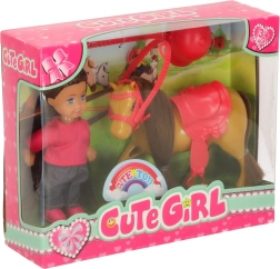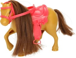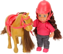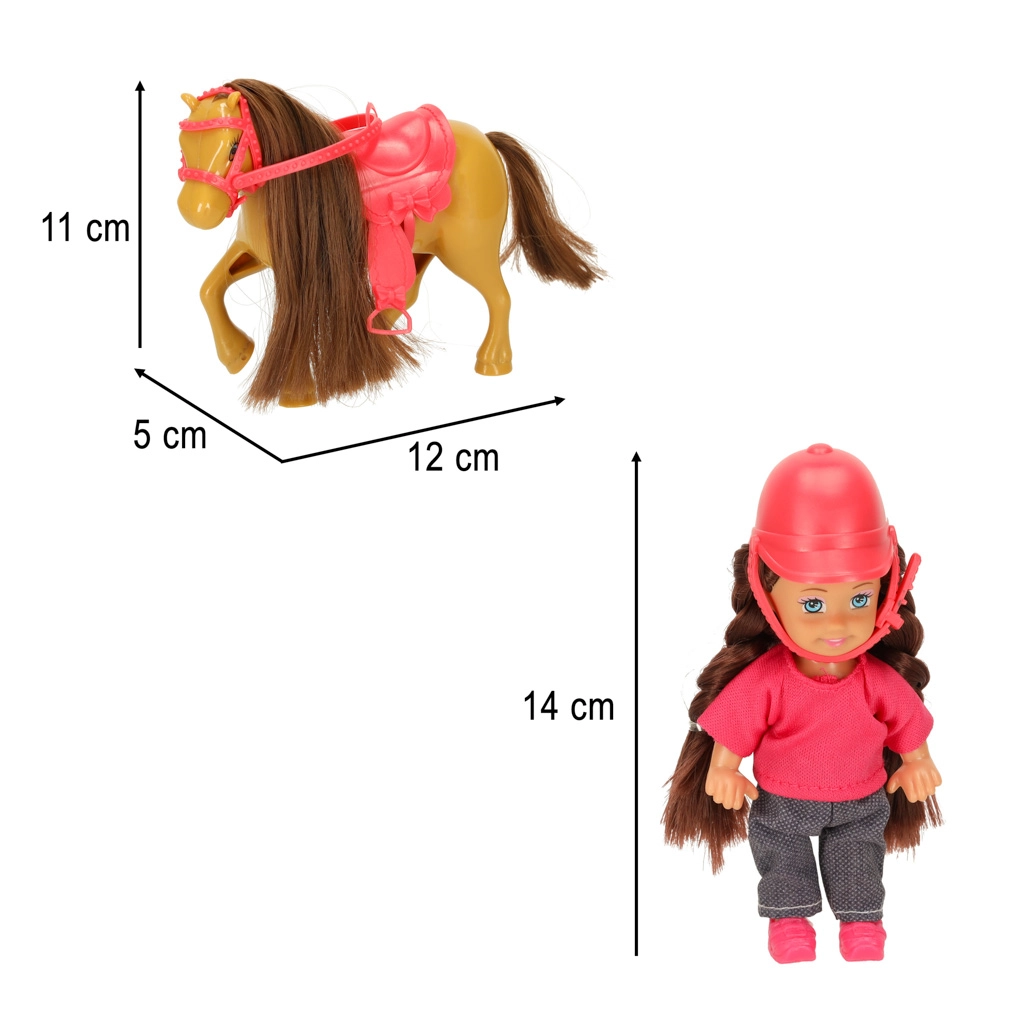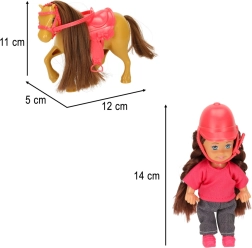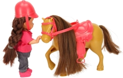 The set is coordinated in a brown–pink color combination and includes 5 pieces with removable accessories. The doll has poseable arms and legs for easy riding, and both figures have long hair suitable for brushing.