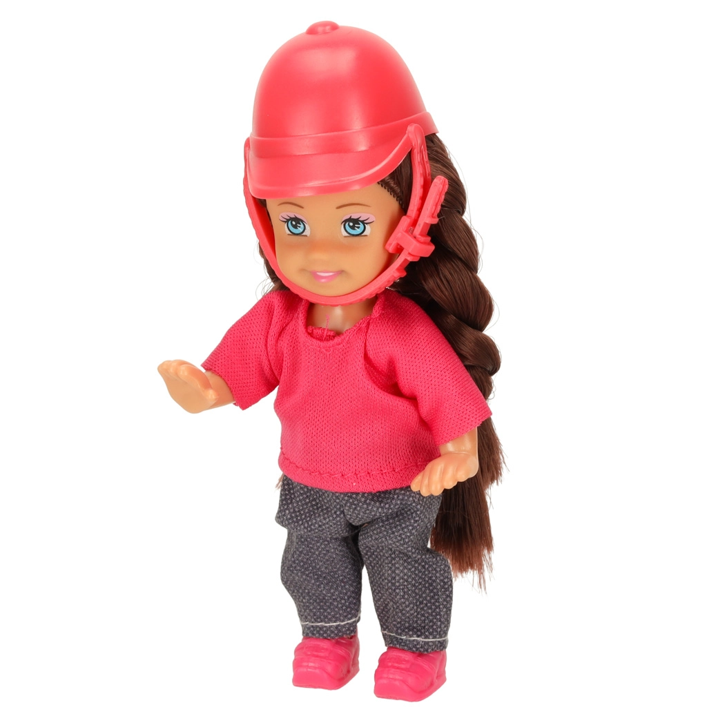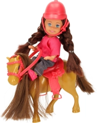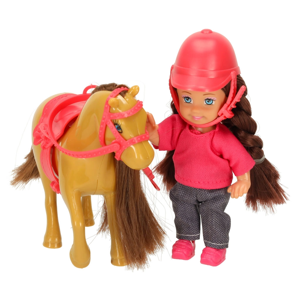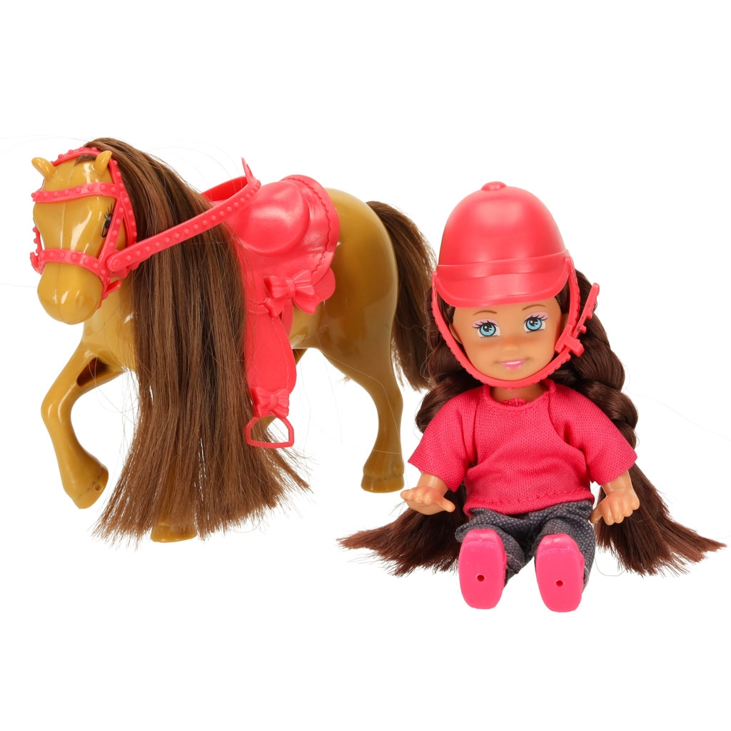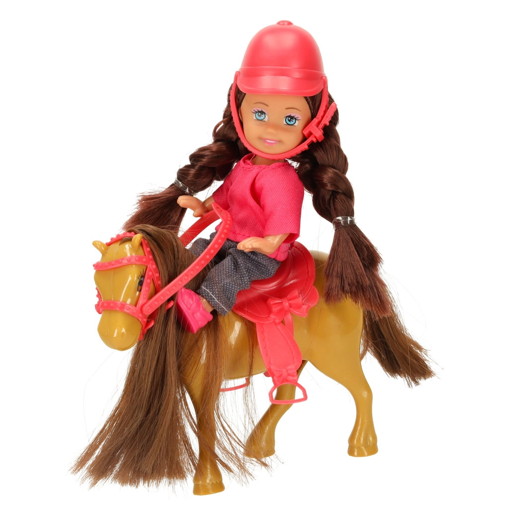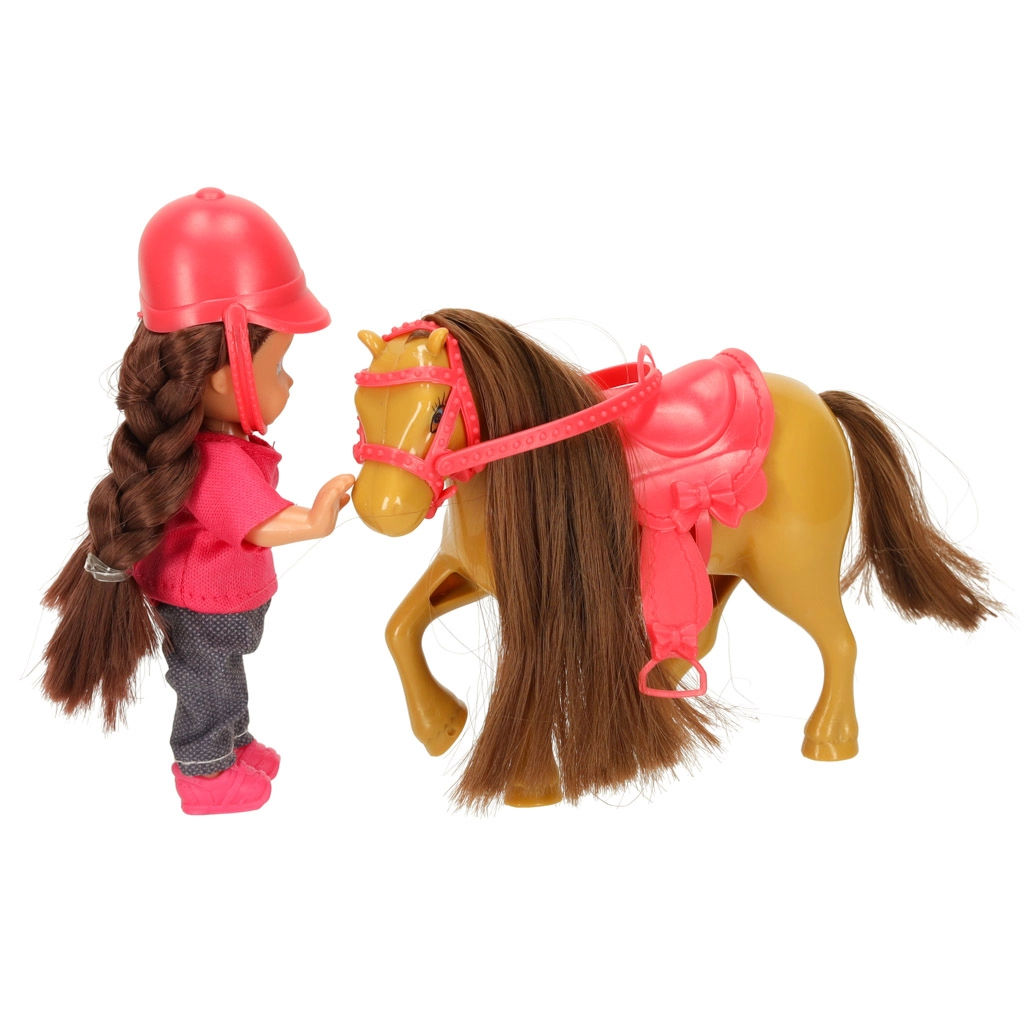 The pony has a saddle and bridle, and the doll has a riding helmet — all are removable for easy outfit changes and scenario play.