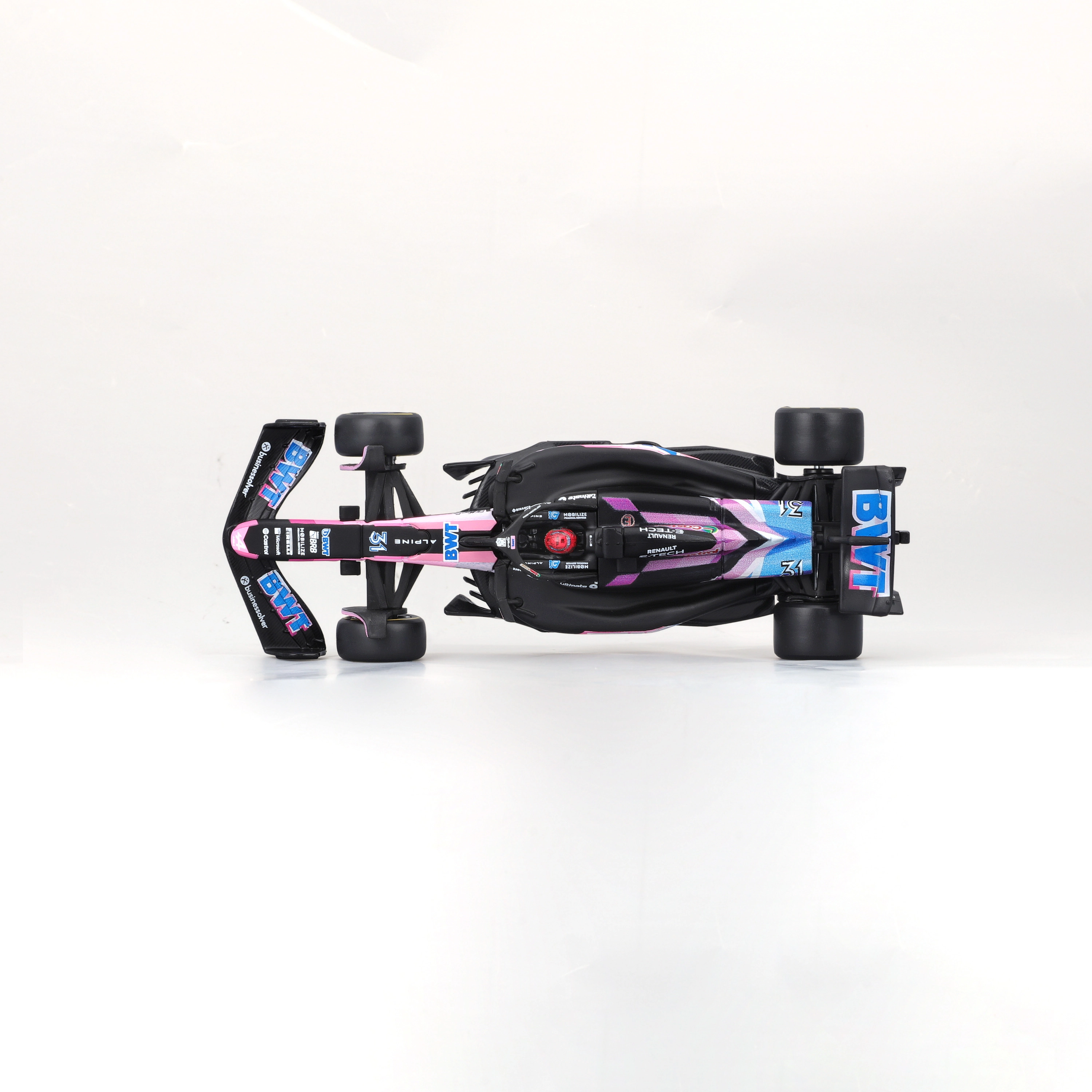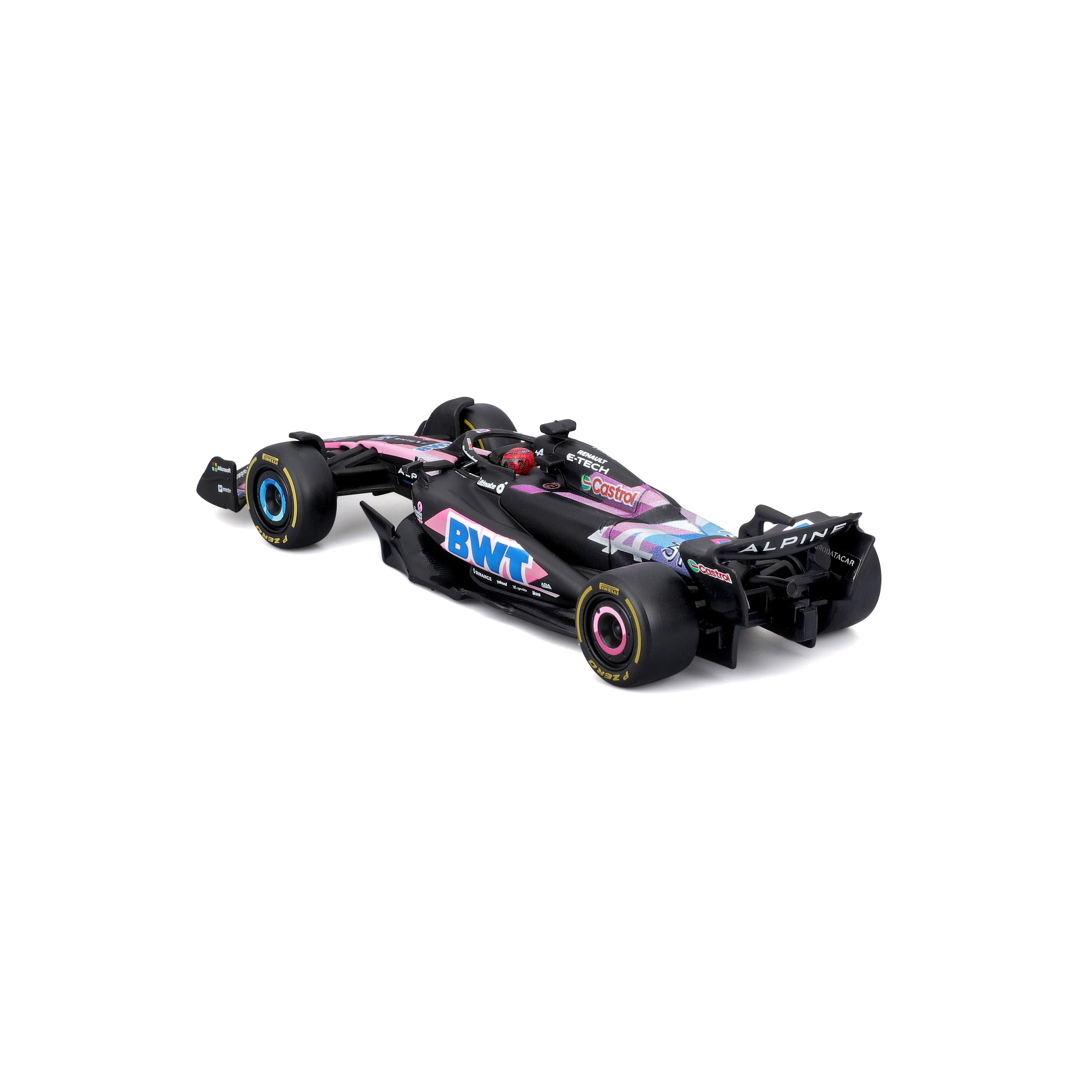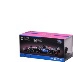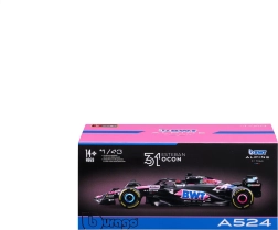 This officially licensed Alpine F1 Team A524 (2024) model by Bburago in 1:43 scale offers an exceptional blend of craftsmanship and authenticity. The black base with BWT pink–blue accents, fine sponsor prints, and aerodynamic elements including the front wing, halo, and rear wing precisely capture Esteban Ocon’s real car.