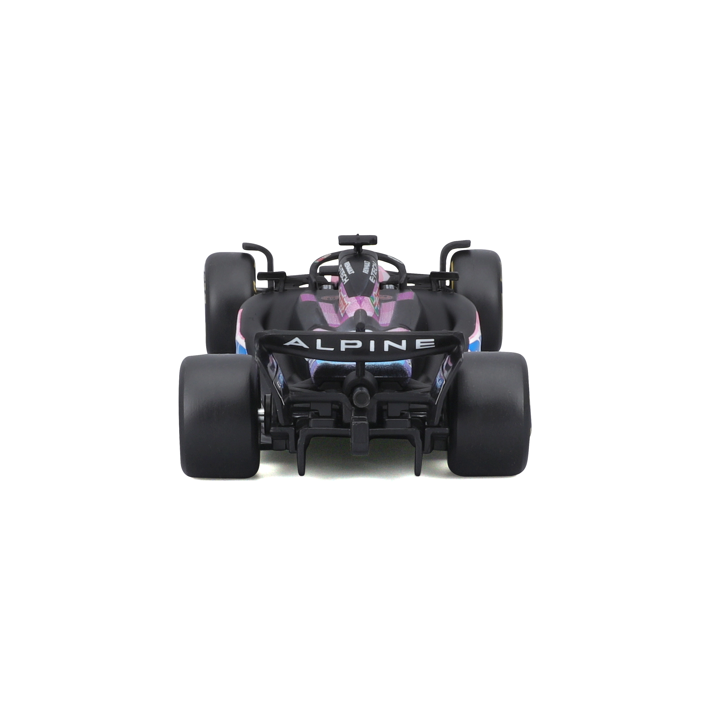 Precise sponsor tampo prints, a black base with pink–blue accents, and realistic aero elements faithfully mirror the real car.